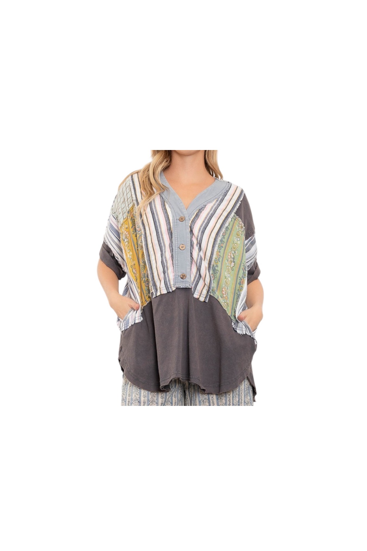 / BLUE VELVET BLOCK PRINT BUTTON FRONT SHORT SLEEVE TOP