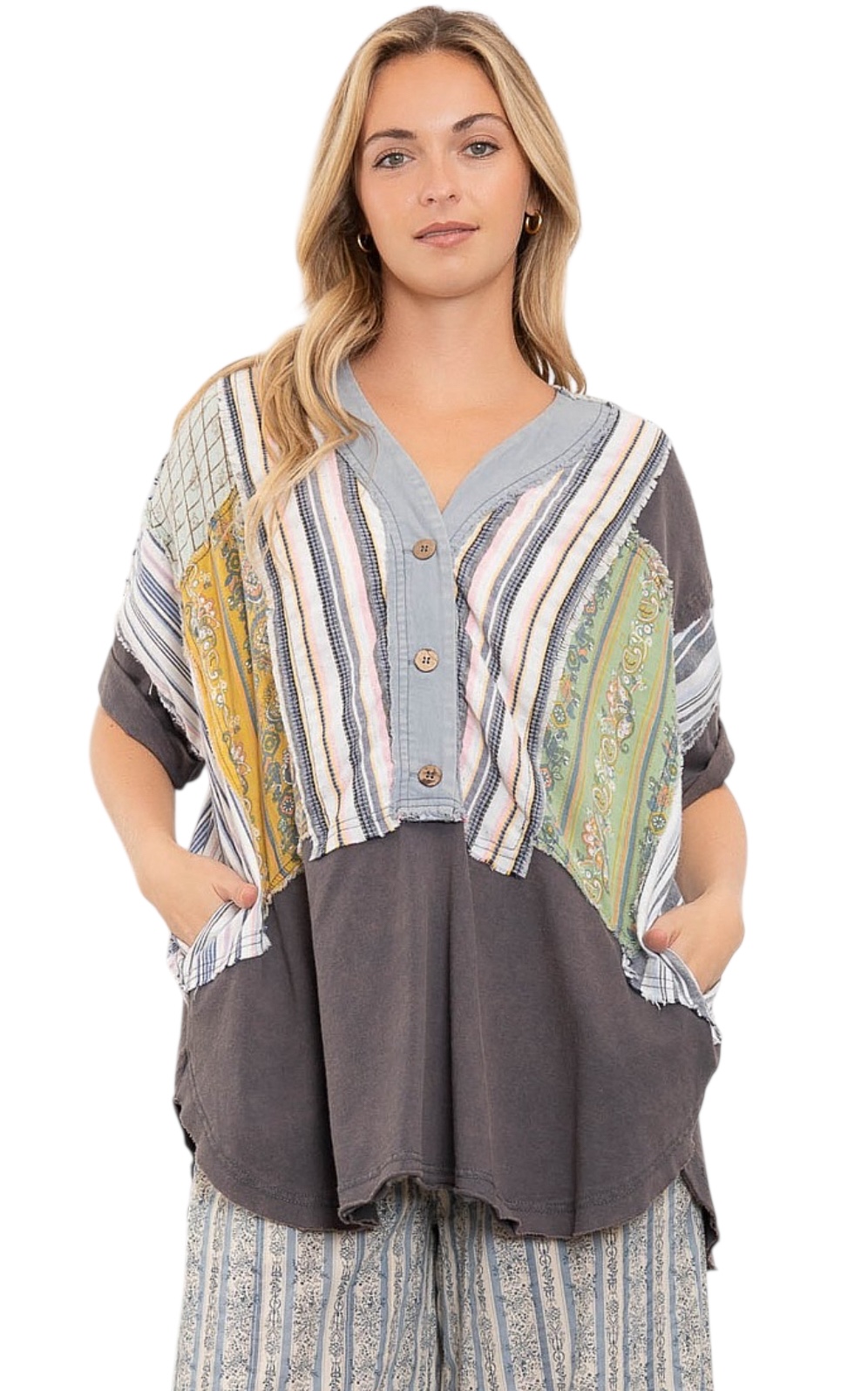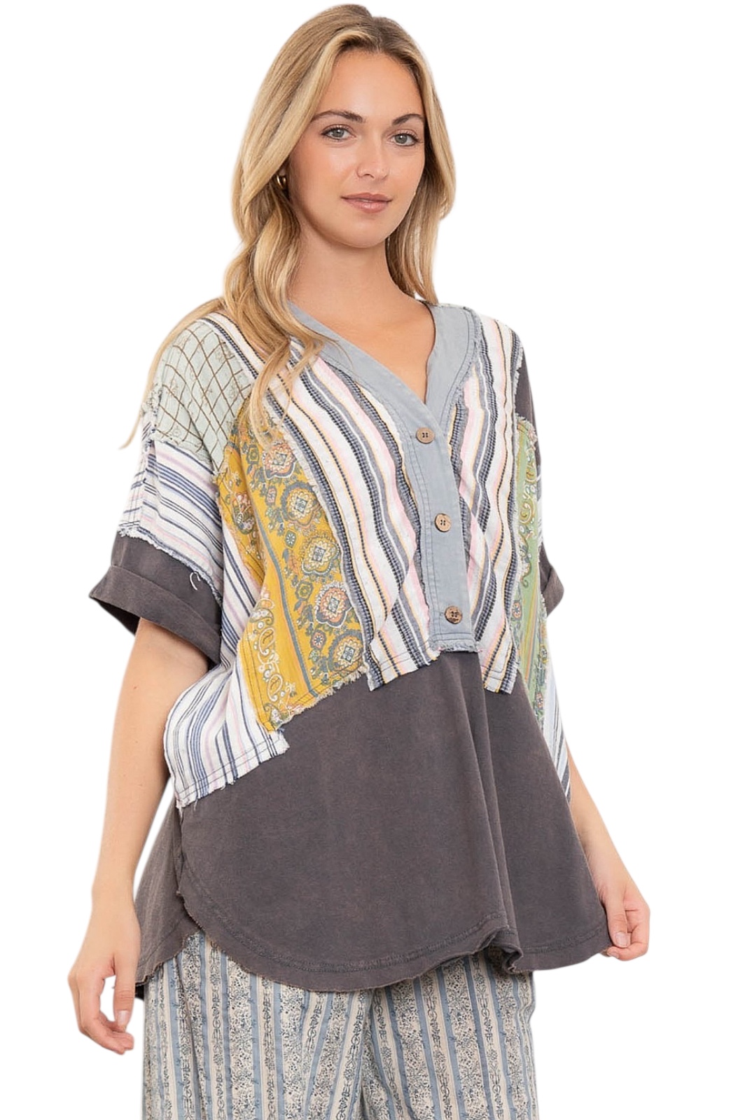 BLUE VELVET BLOCK PRINT BUTTON FRONT SHORT SLEEVE TOP