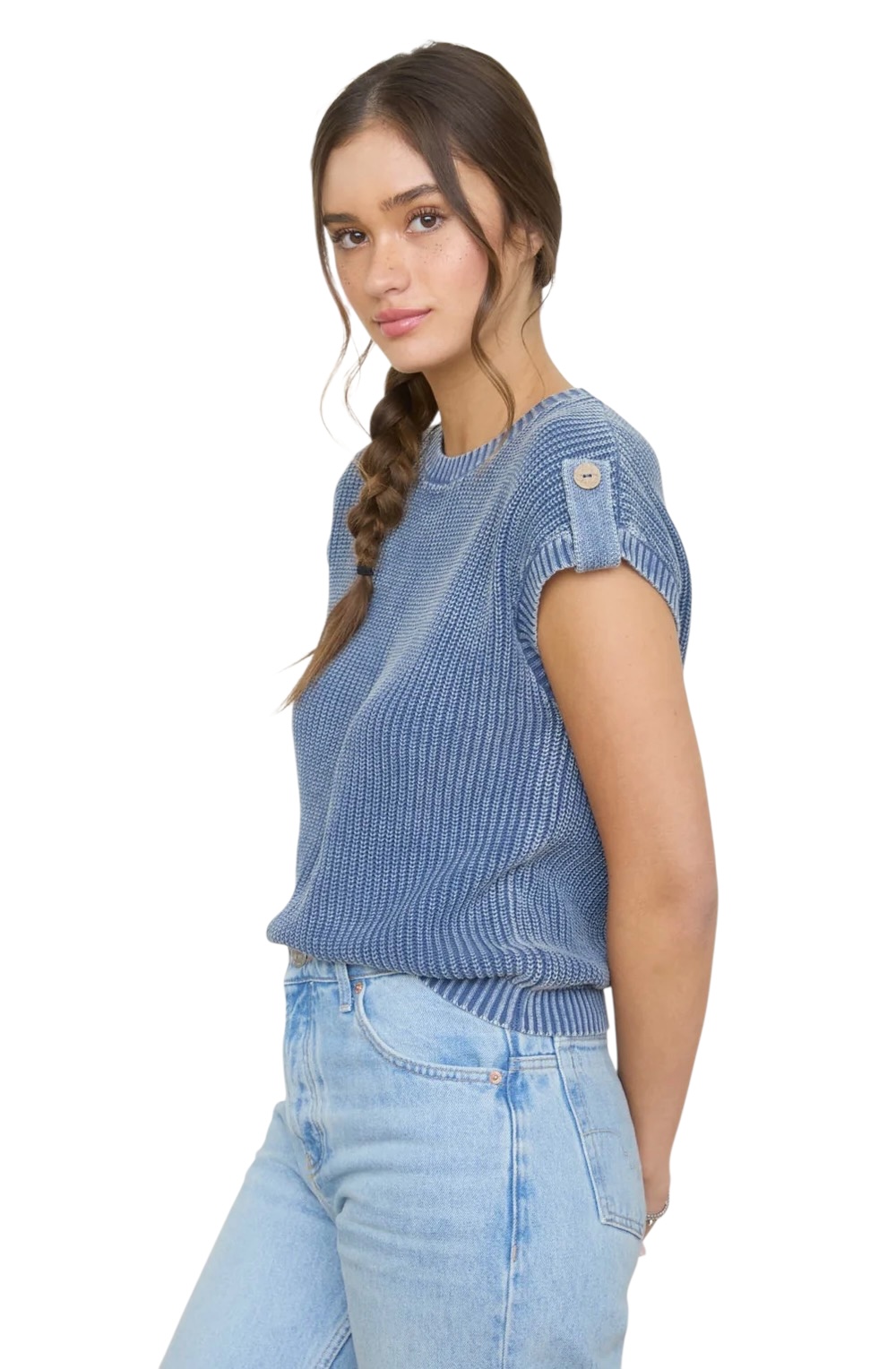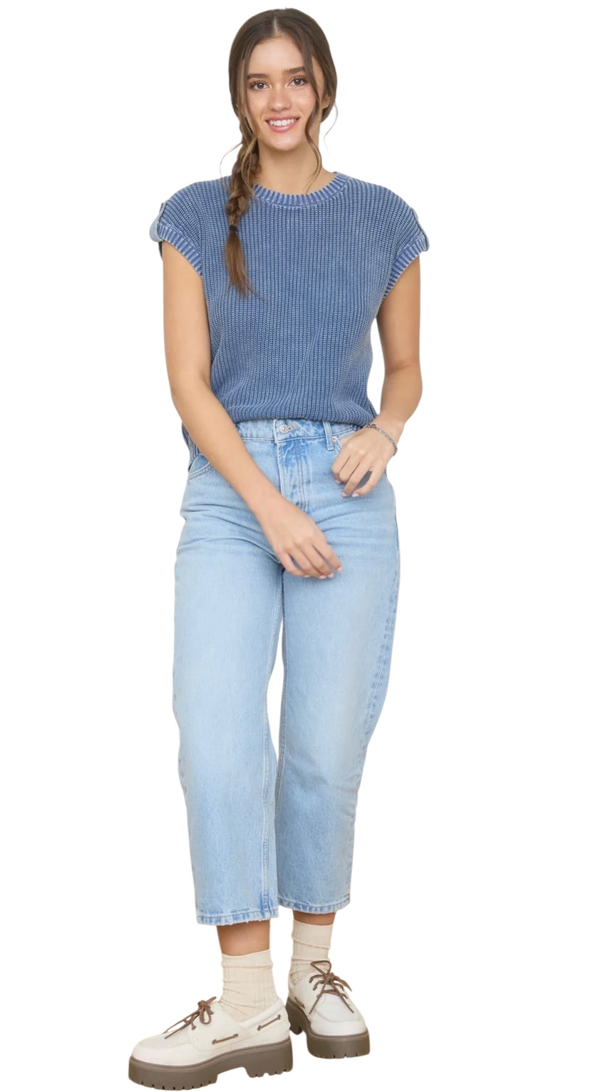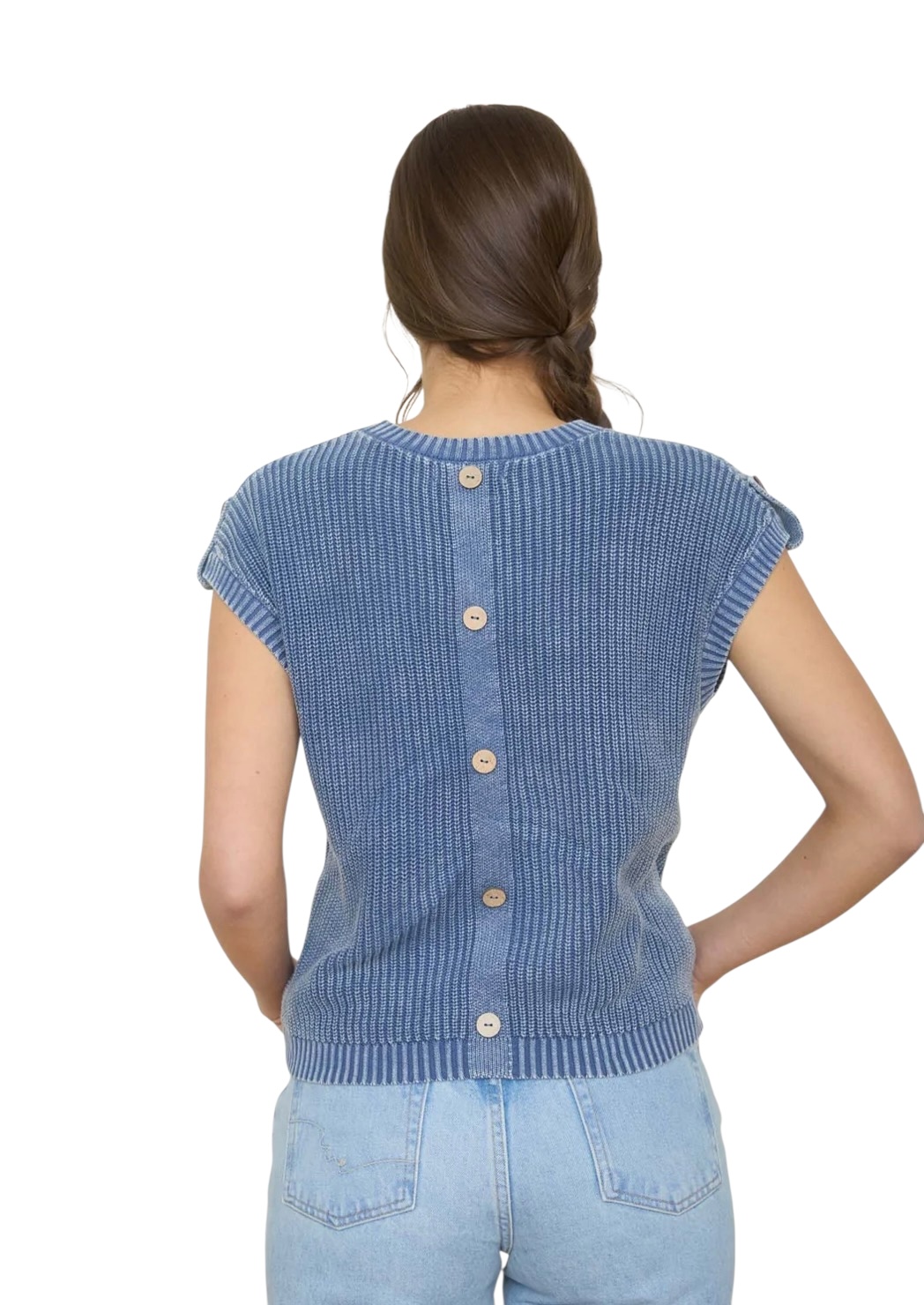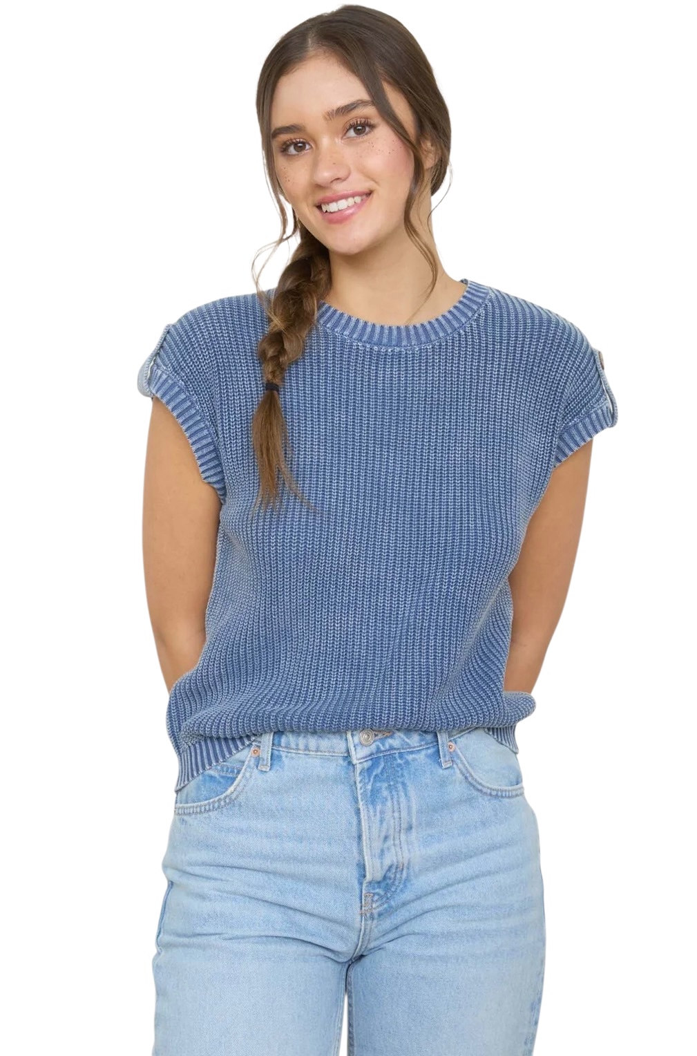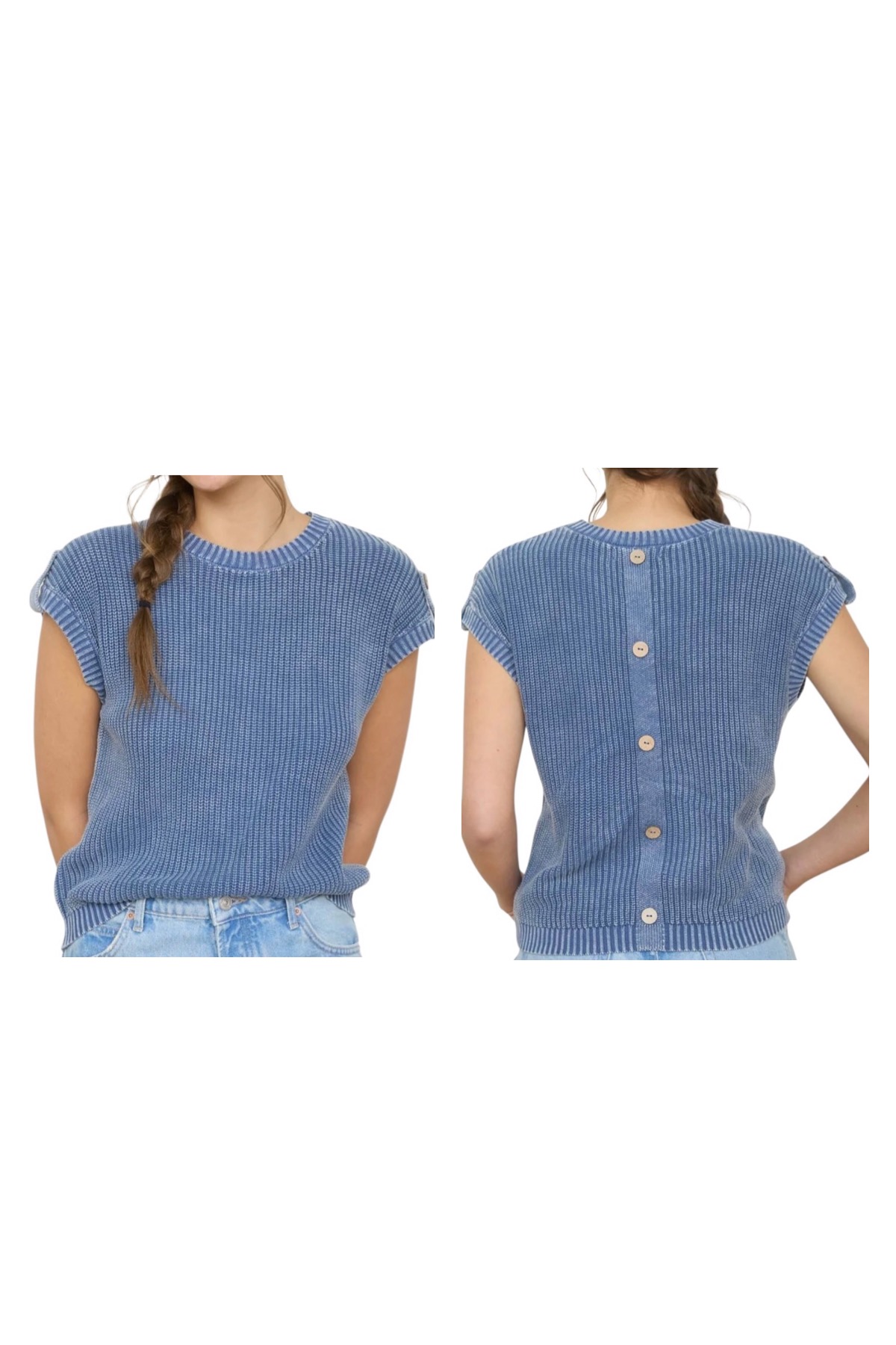 BLUPEPPER ACID WASH TAB SLEEVE BUTTON BACK SWEATER