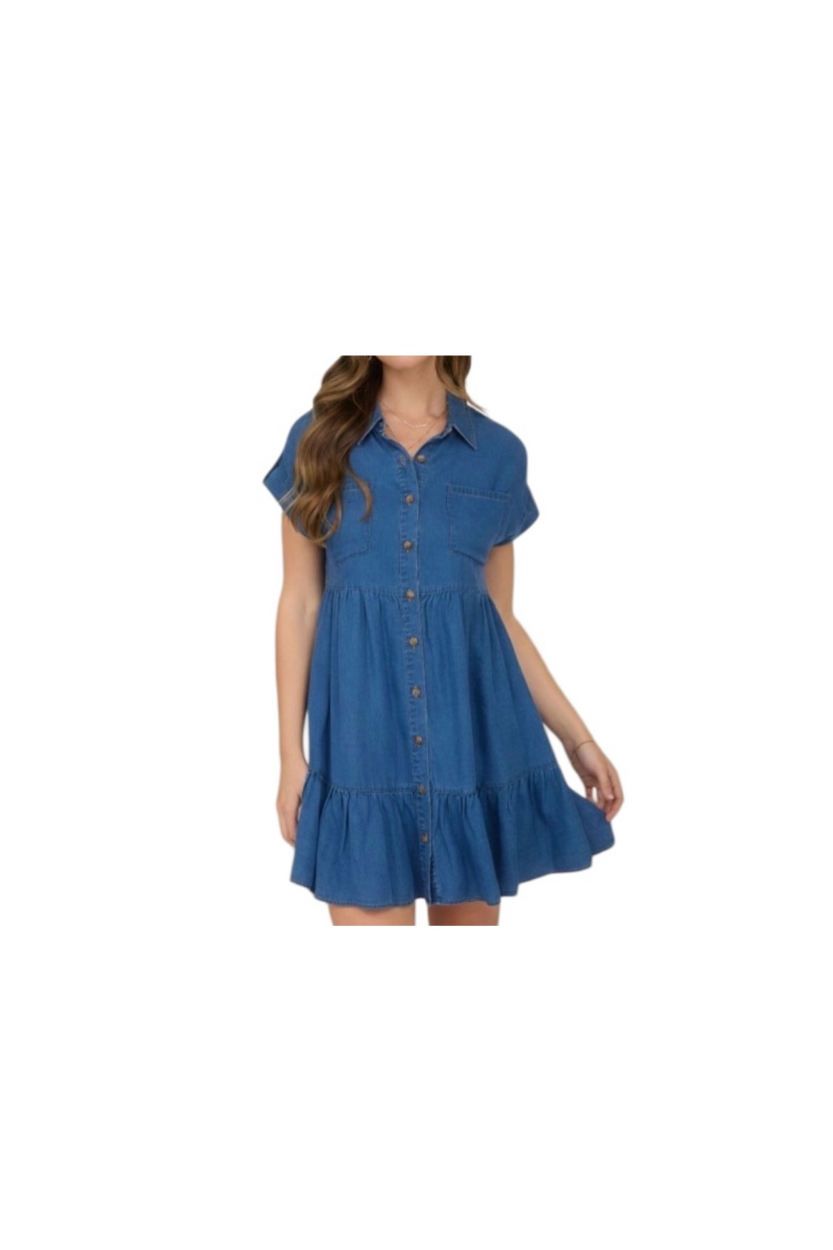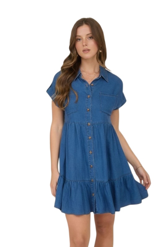/ BLUPEPPER DARK CHAMBRAY SHORT SLEEVE TIERED MINI DRESS