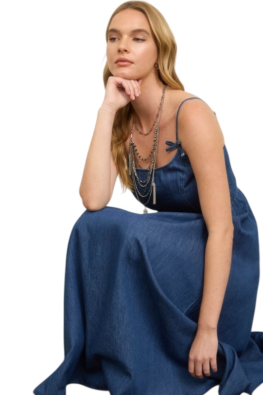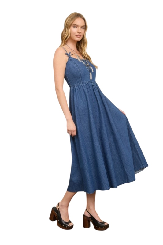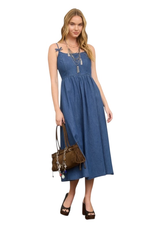 BLUPEPPER DENIM BOW STRAP MIDI DRESS