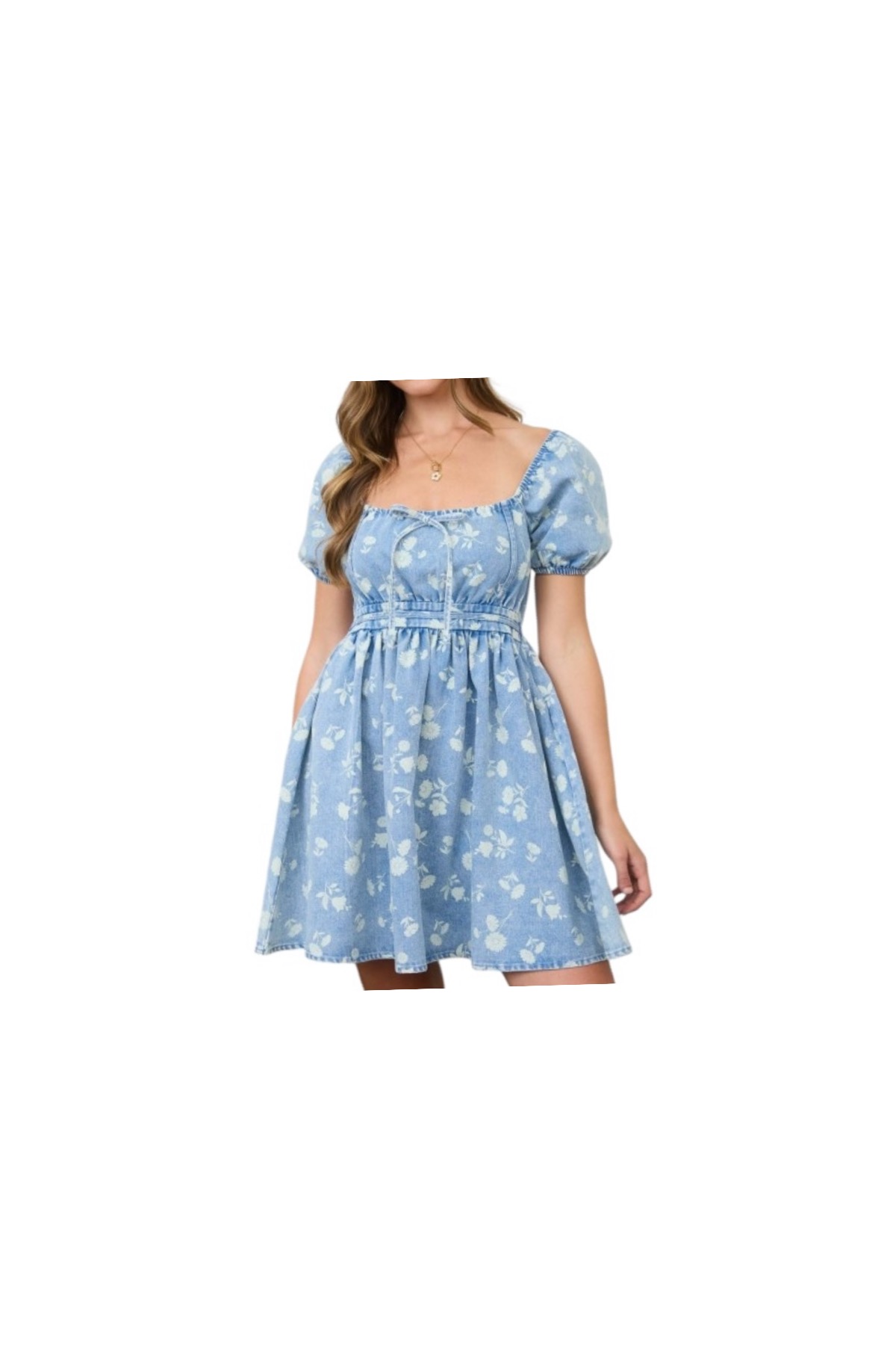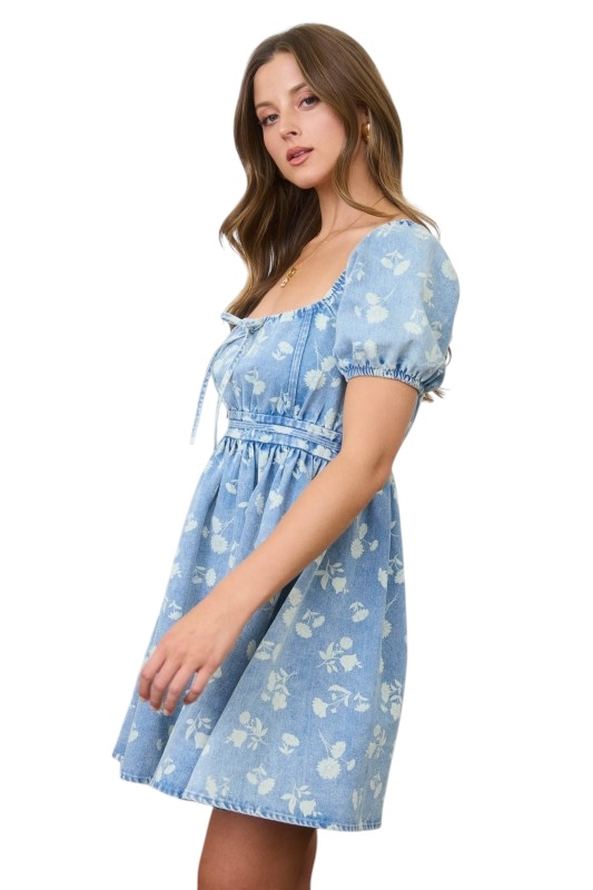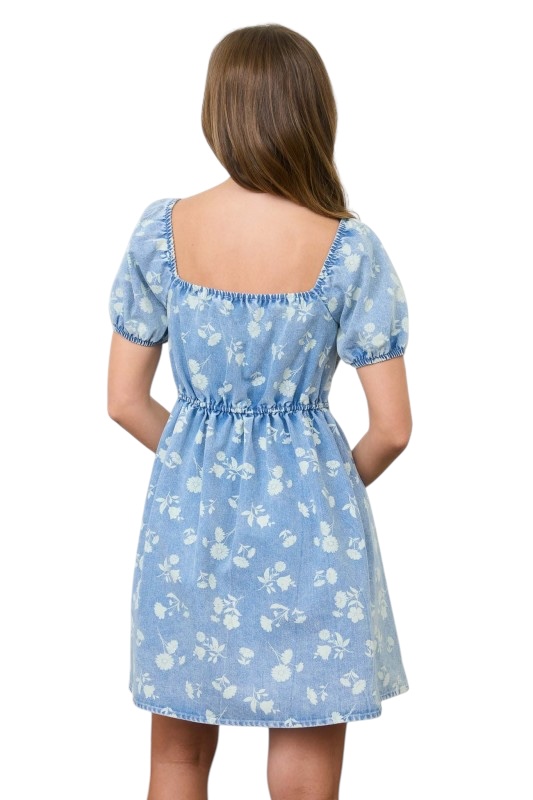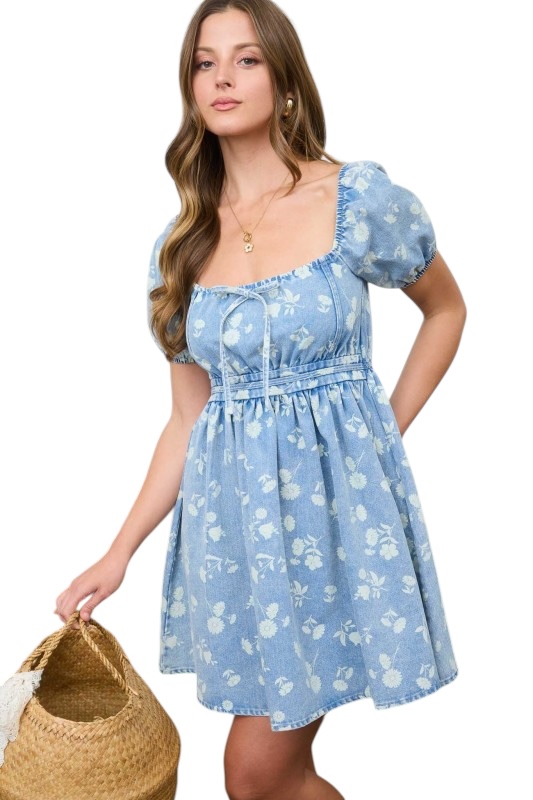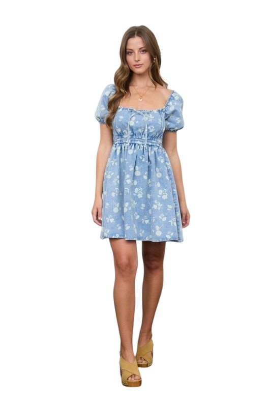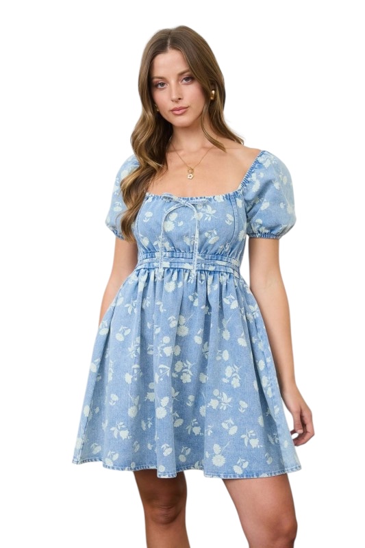 / BLUPEPPER FLORAL DENIM PUFF SLEEVE MINI DRESS