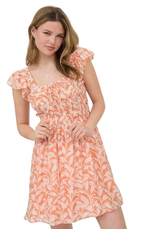 SCOOP NECKLINE SHORT RUFFLE SLEEVES FRONT TIE SMOCKED BODICE A-LINE MINI DRESS LEAF PRINT SHELL: 80% RAYON, 20% NYLON LINING: 100% POLYESTER
