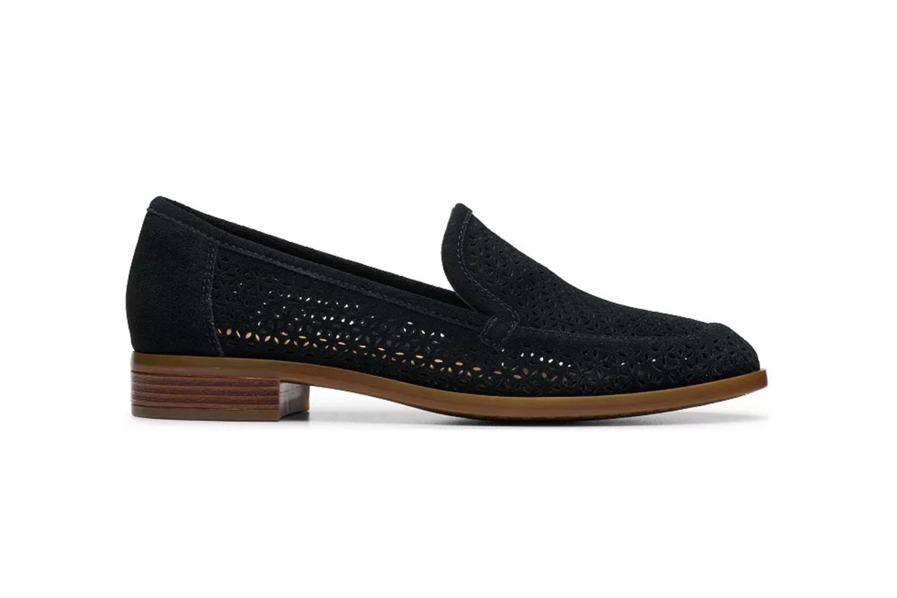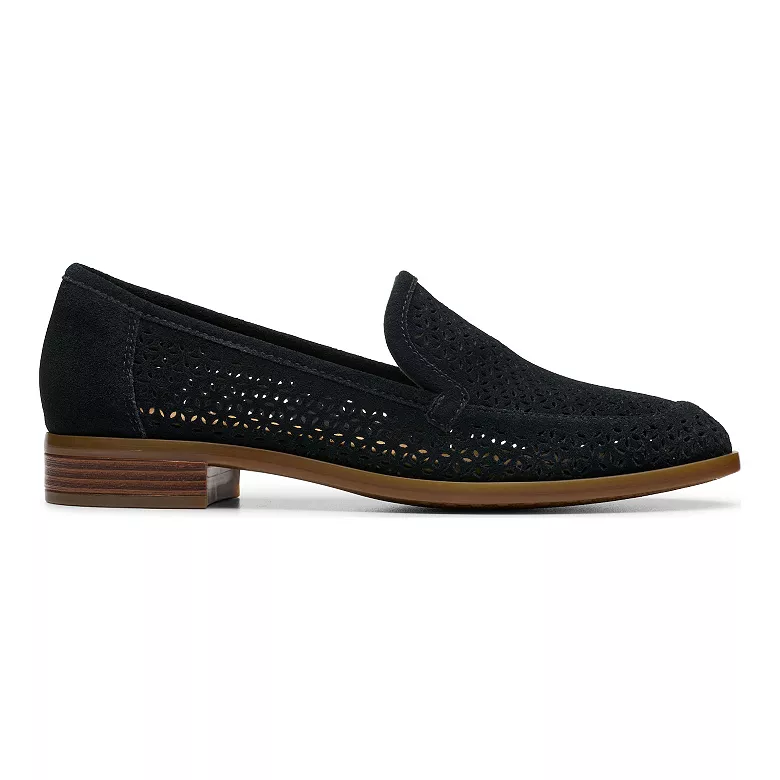 Add a playful pop to your professional looks with the Trish Cove loafers from Clarks. This suede pair features a tailored silhouette, complete with a classic cutaway lip, a slight stacked heel, and a moc toe design. Complete with floral perforations that are embossed throughout the upper.