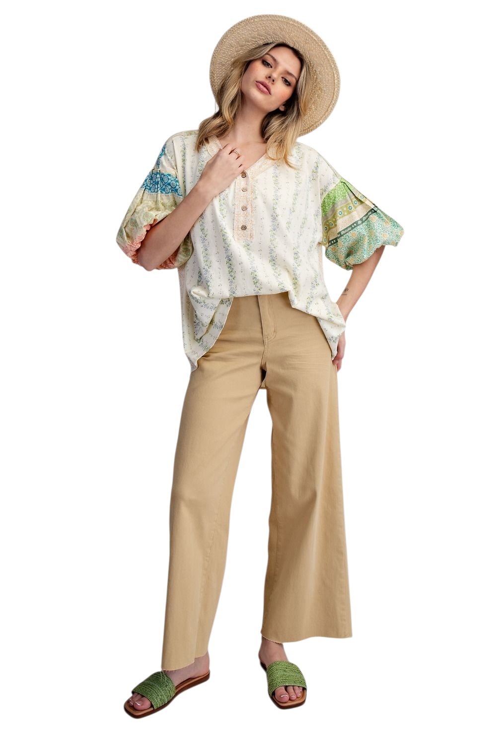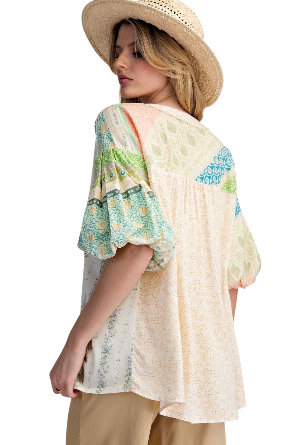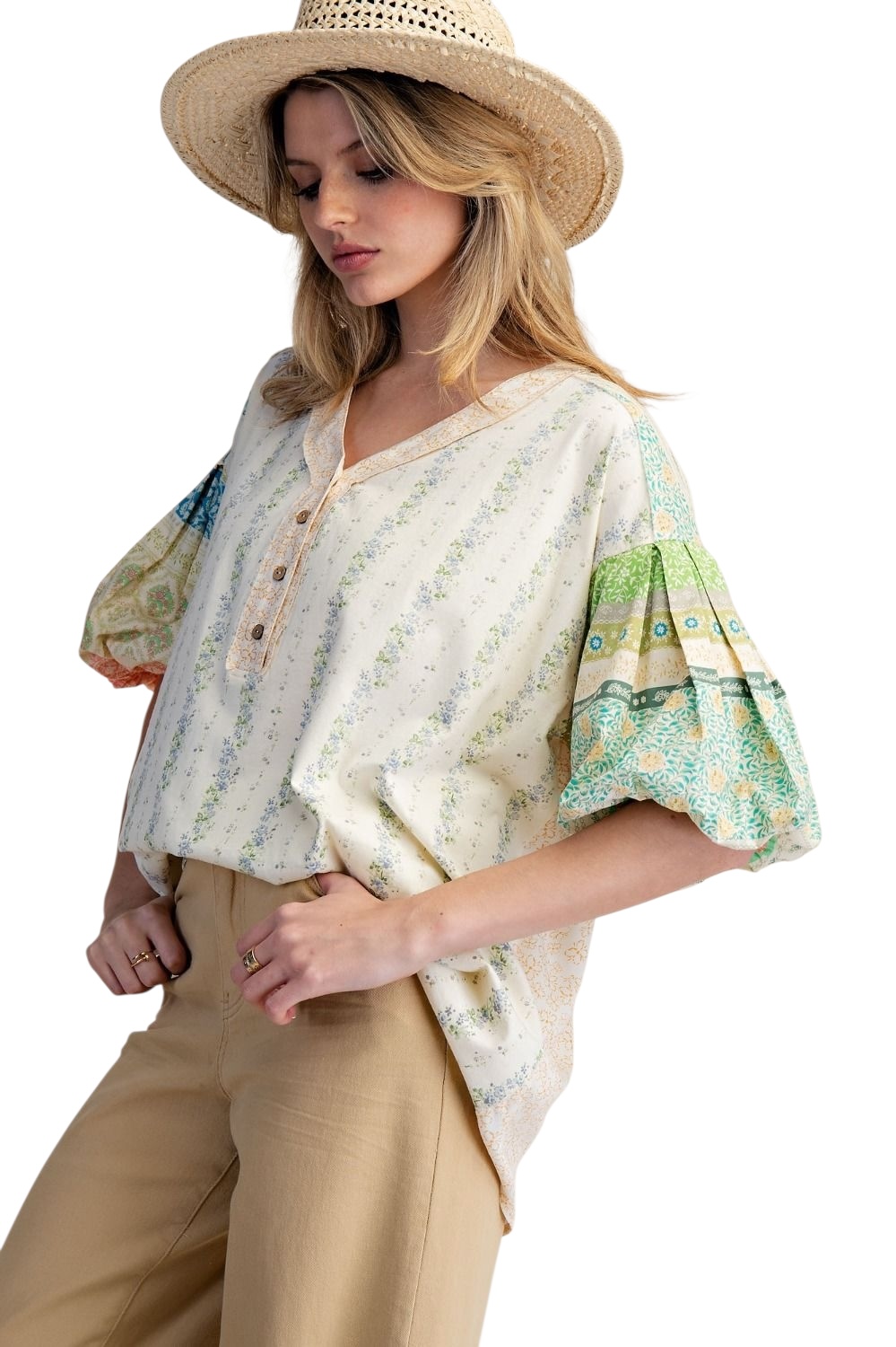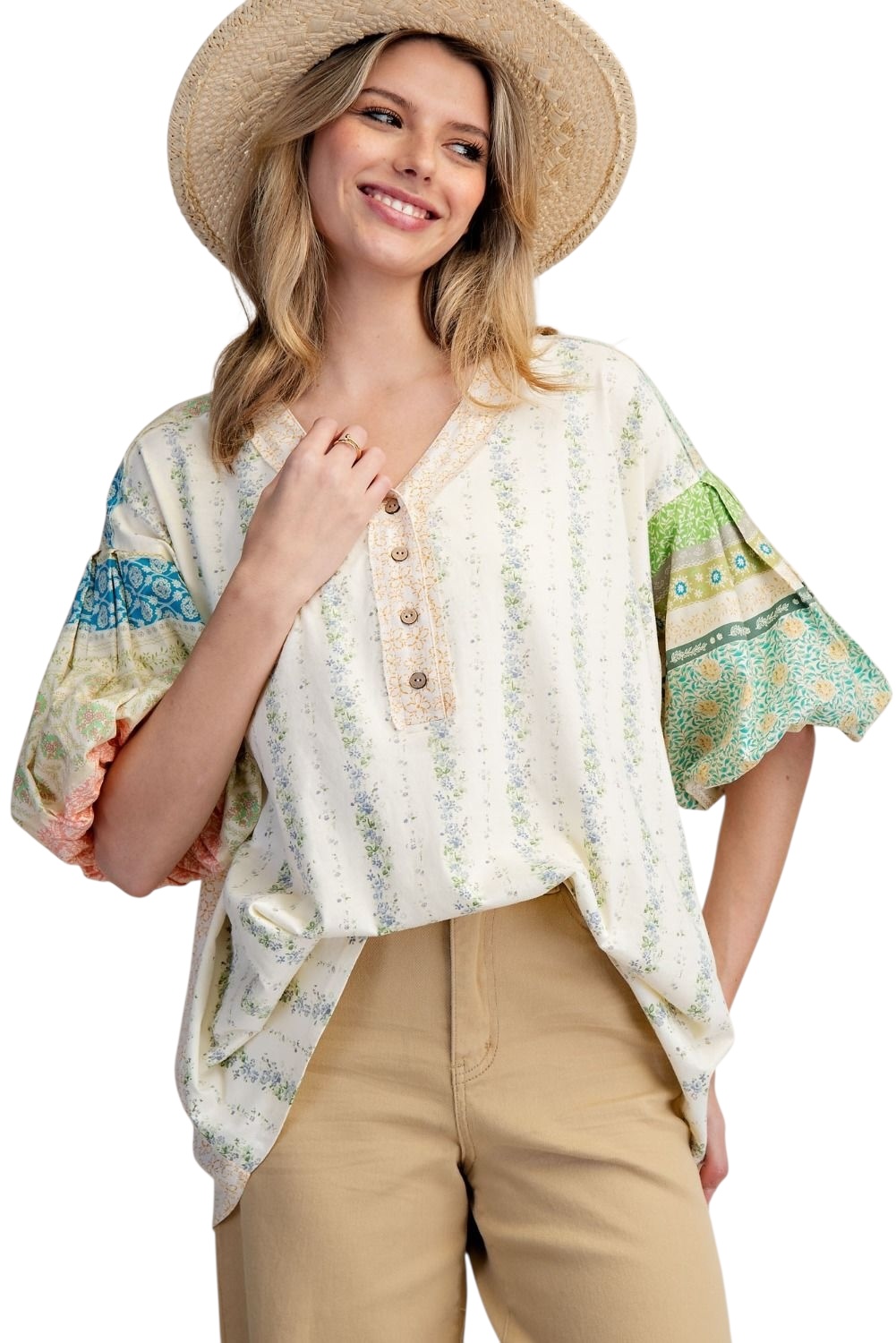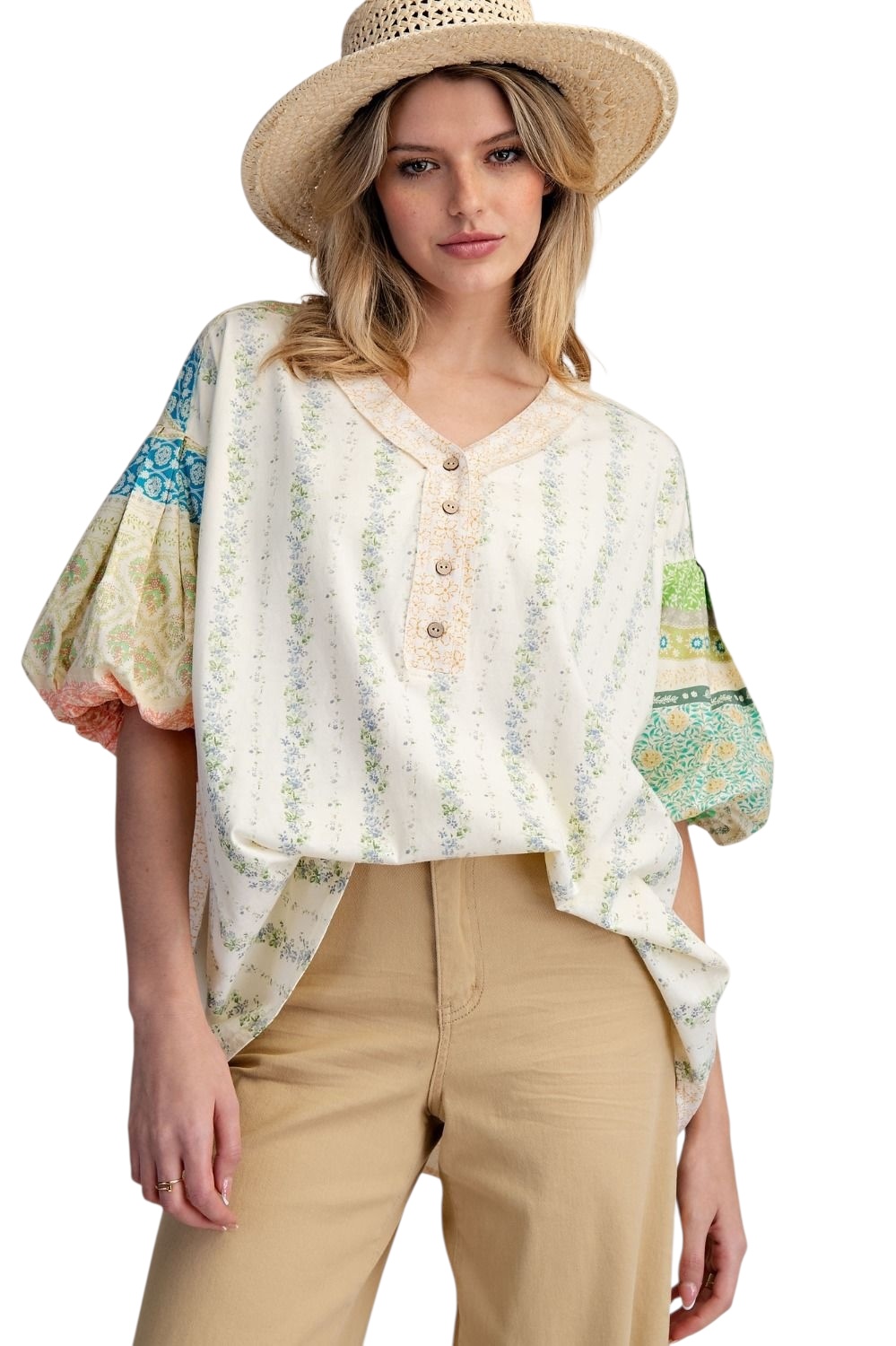 EASEL BUBBLE SLEEVE MIX PRINT TOP