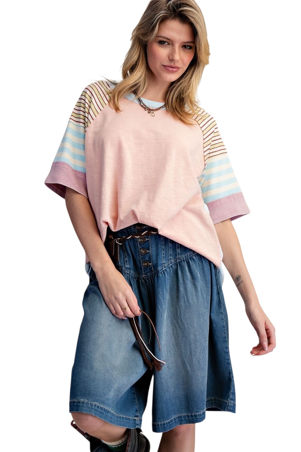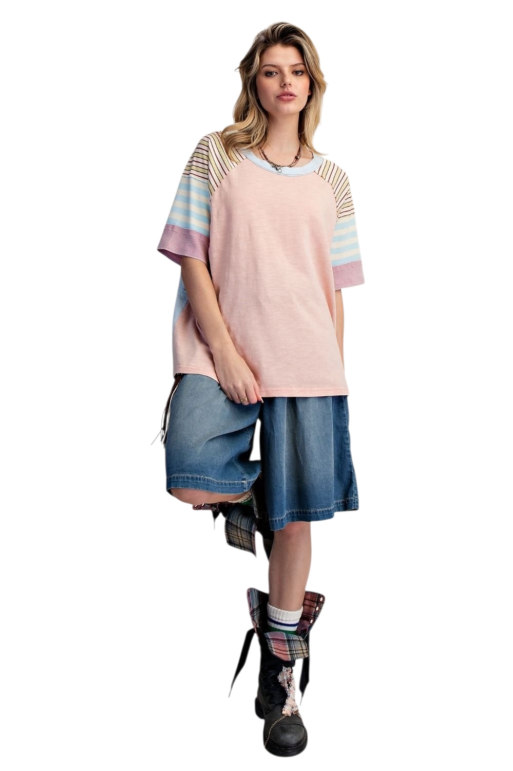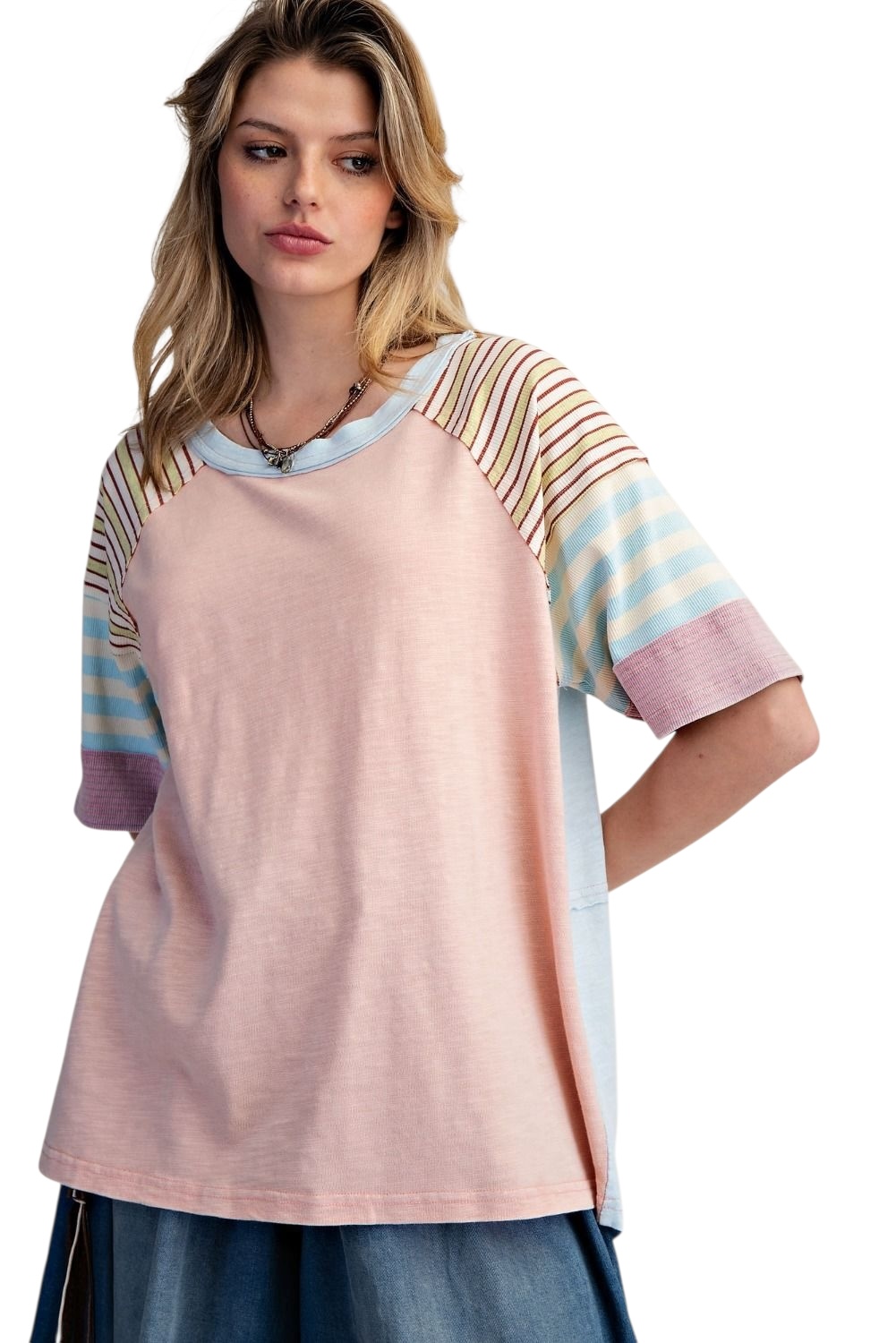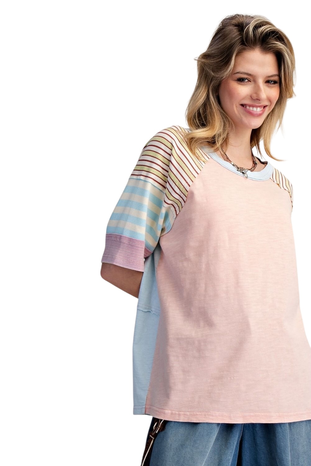EASEL HALF SLEEVE STRIPE MIX COTTON TOP