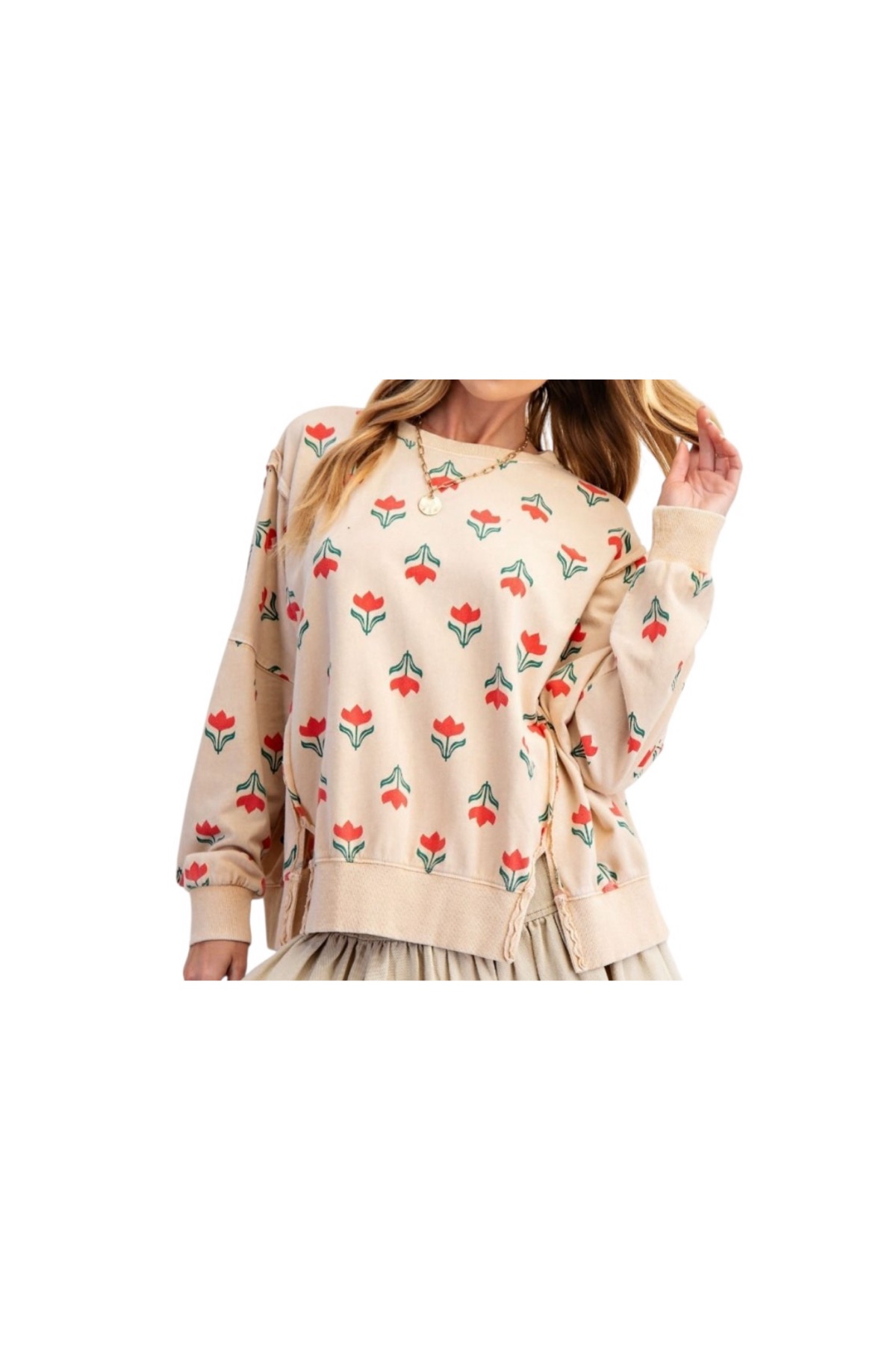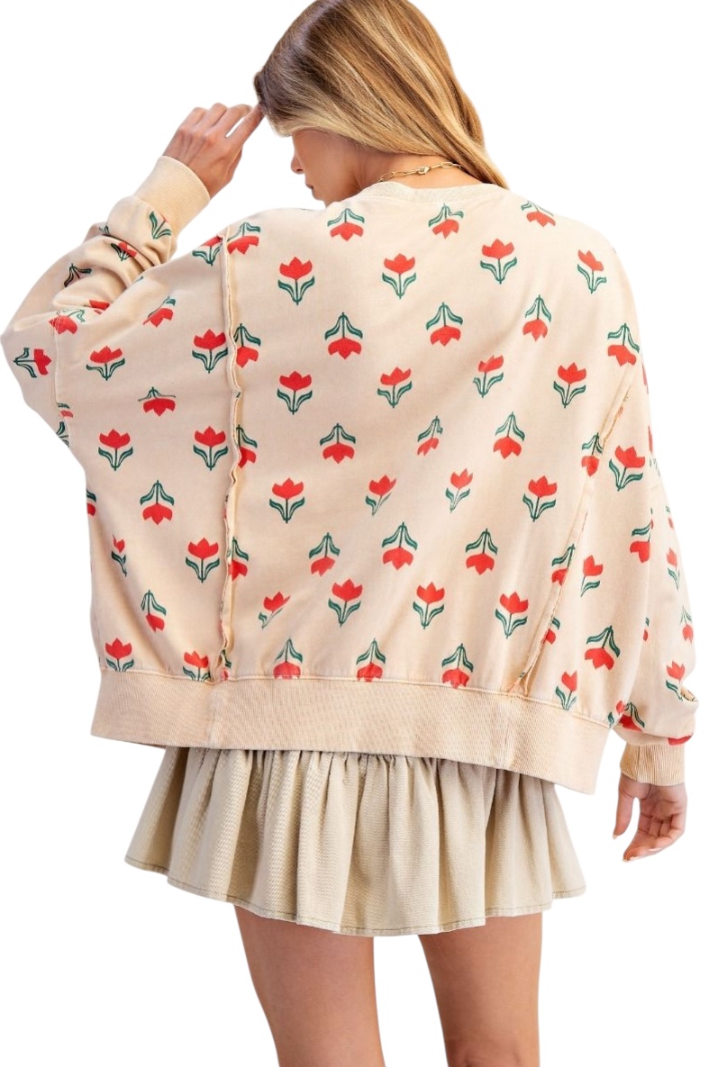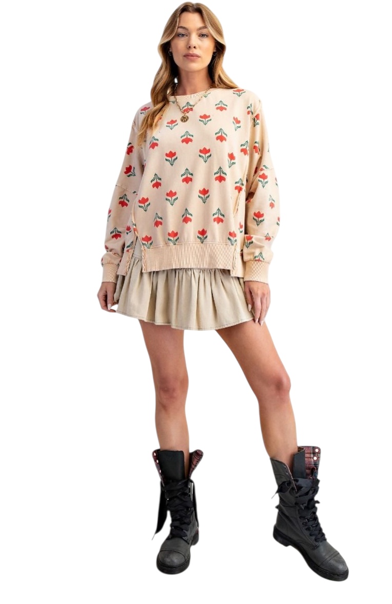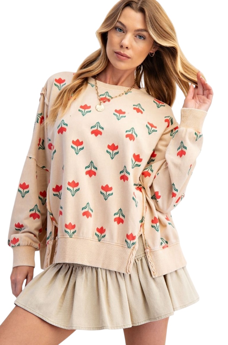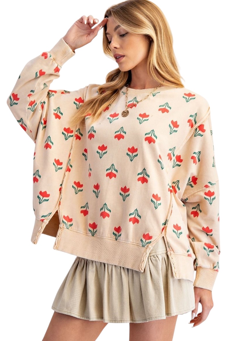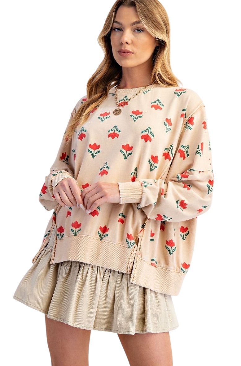 EASEL LONG SLEEVE FLOWER PRINT MINERAL WASH TOP