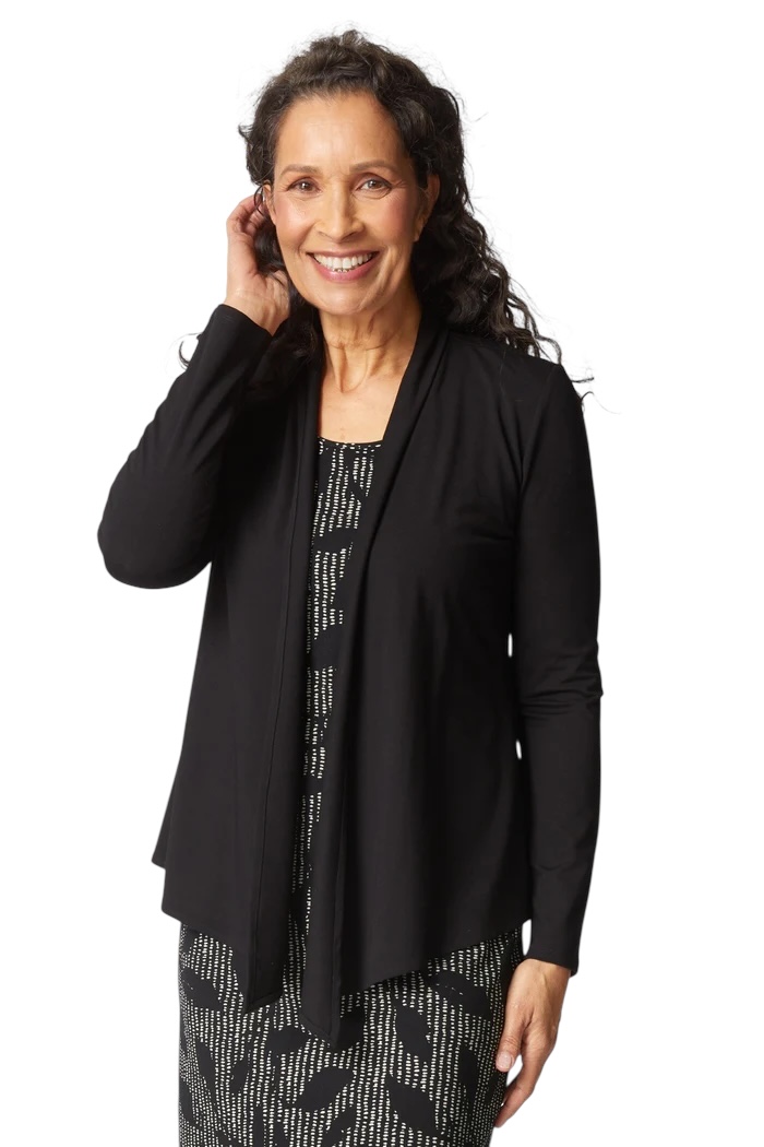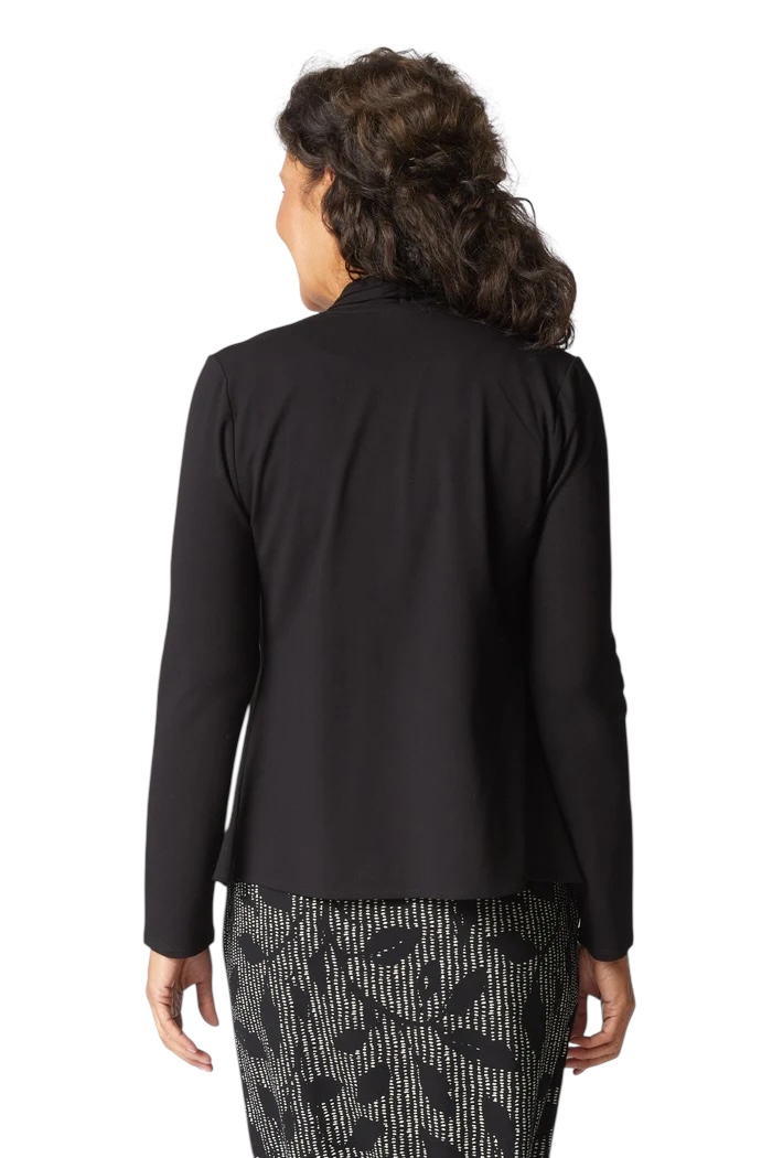 Our signature core travel fabric now in a new jacket shape. Waterfall front, hip length, perfect “over a dress or tank” jacket. A wardrobe staple with a kick. Our rayon spandex jersey conceals bumps and bulges and moves with you for all day comfort.