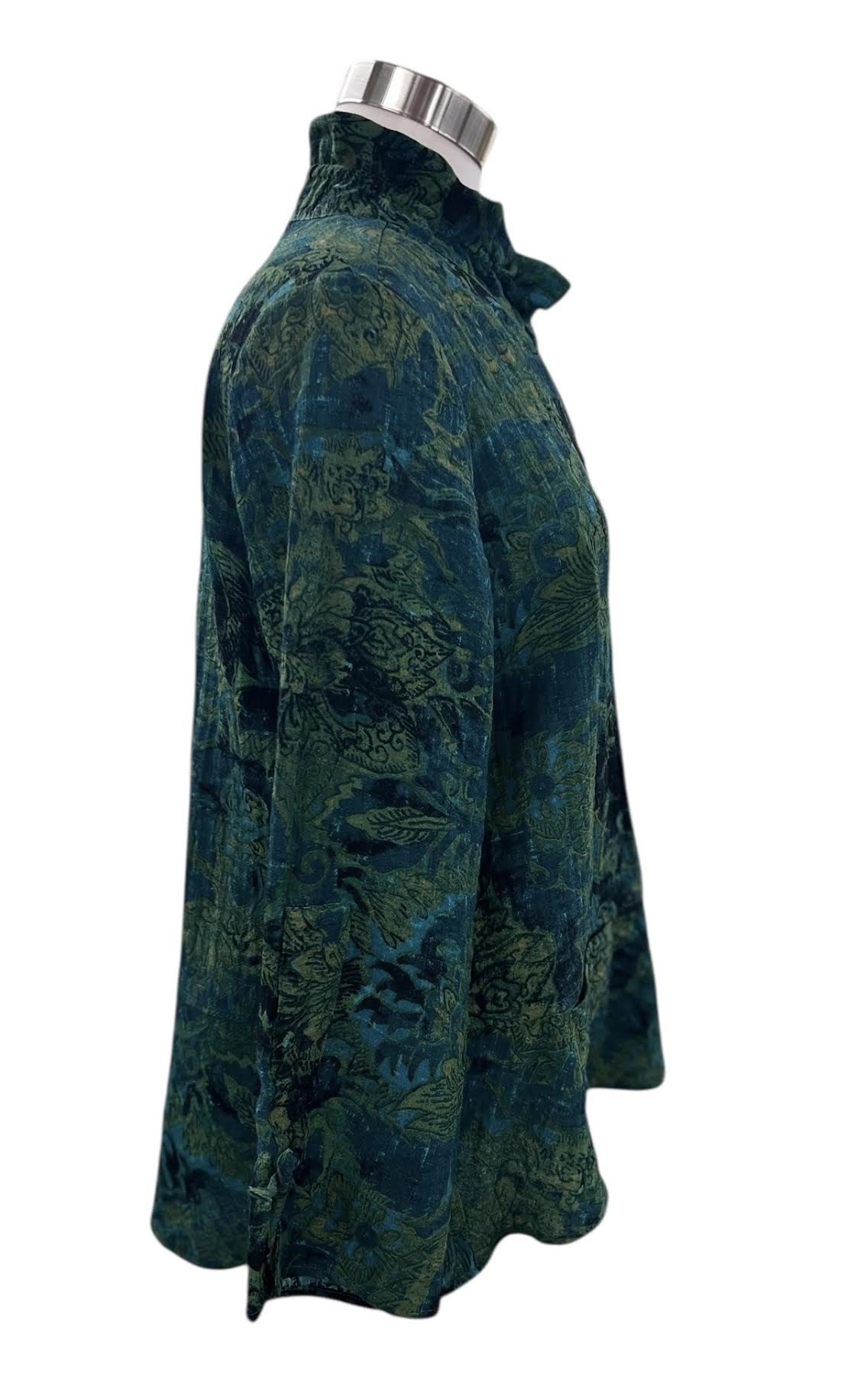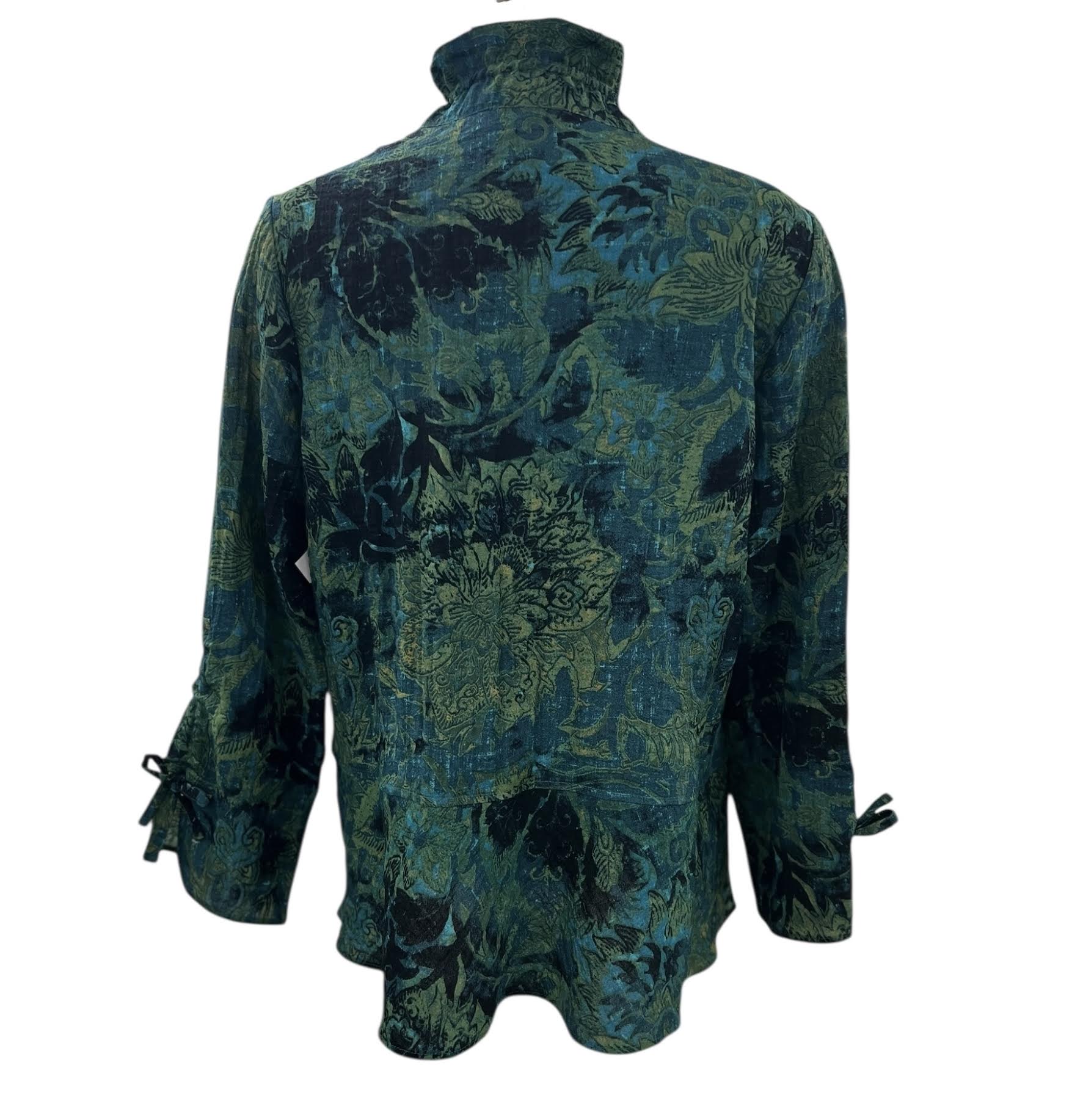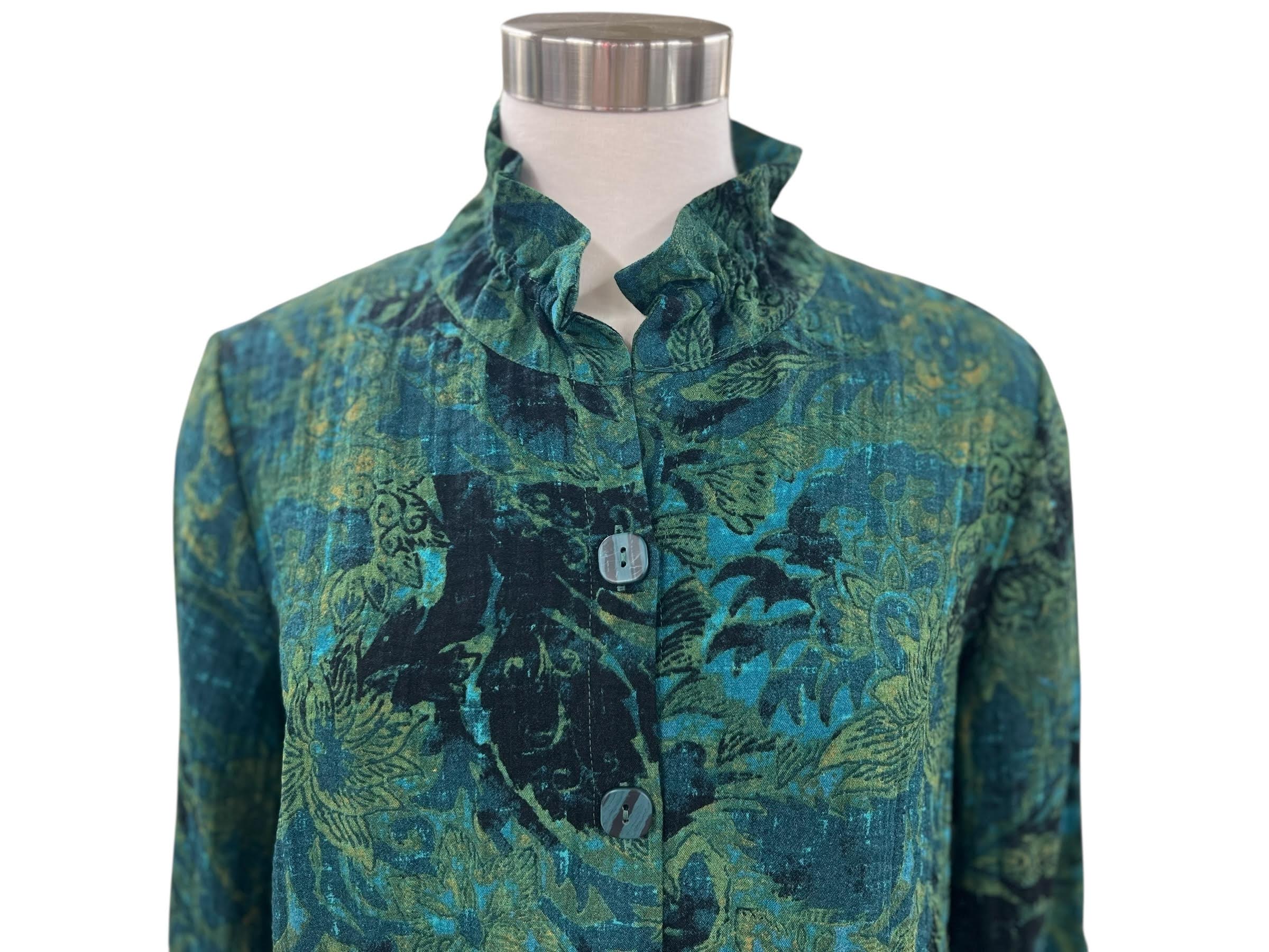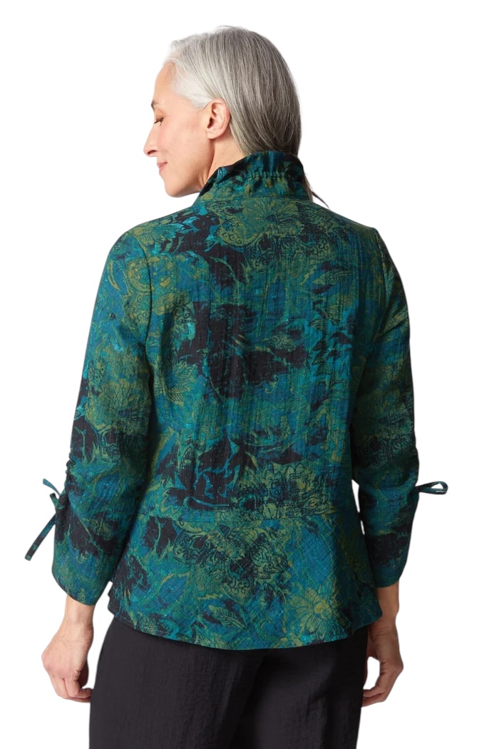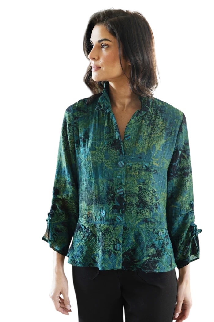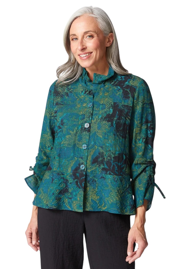 Travel friendly Rayon/Nylon blend with a slightly textured crinkle effect. Ruched collar and sleeves, built in pockets and dyed to match buttons. Easy to dress up or down.