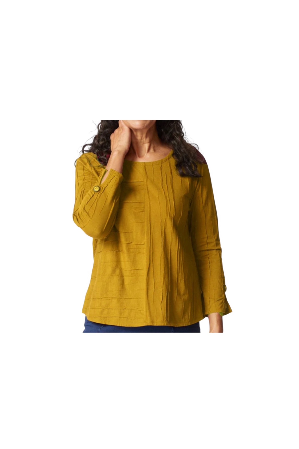 Rounded hem and pretty slit sleeve detail with buttons. Easy scoop neck.