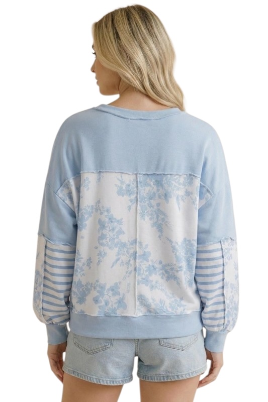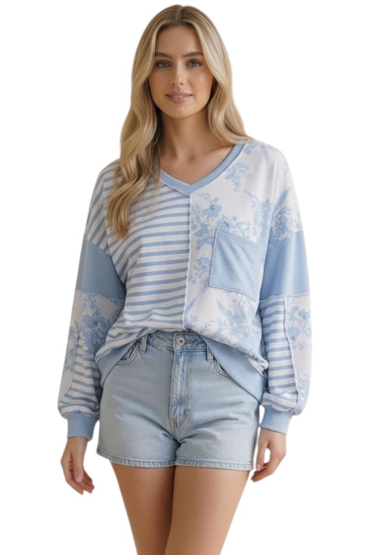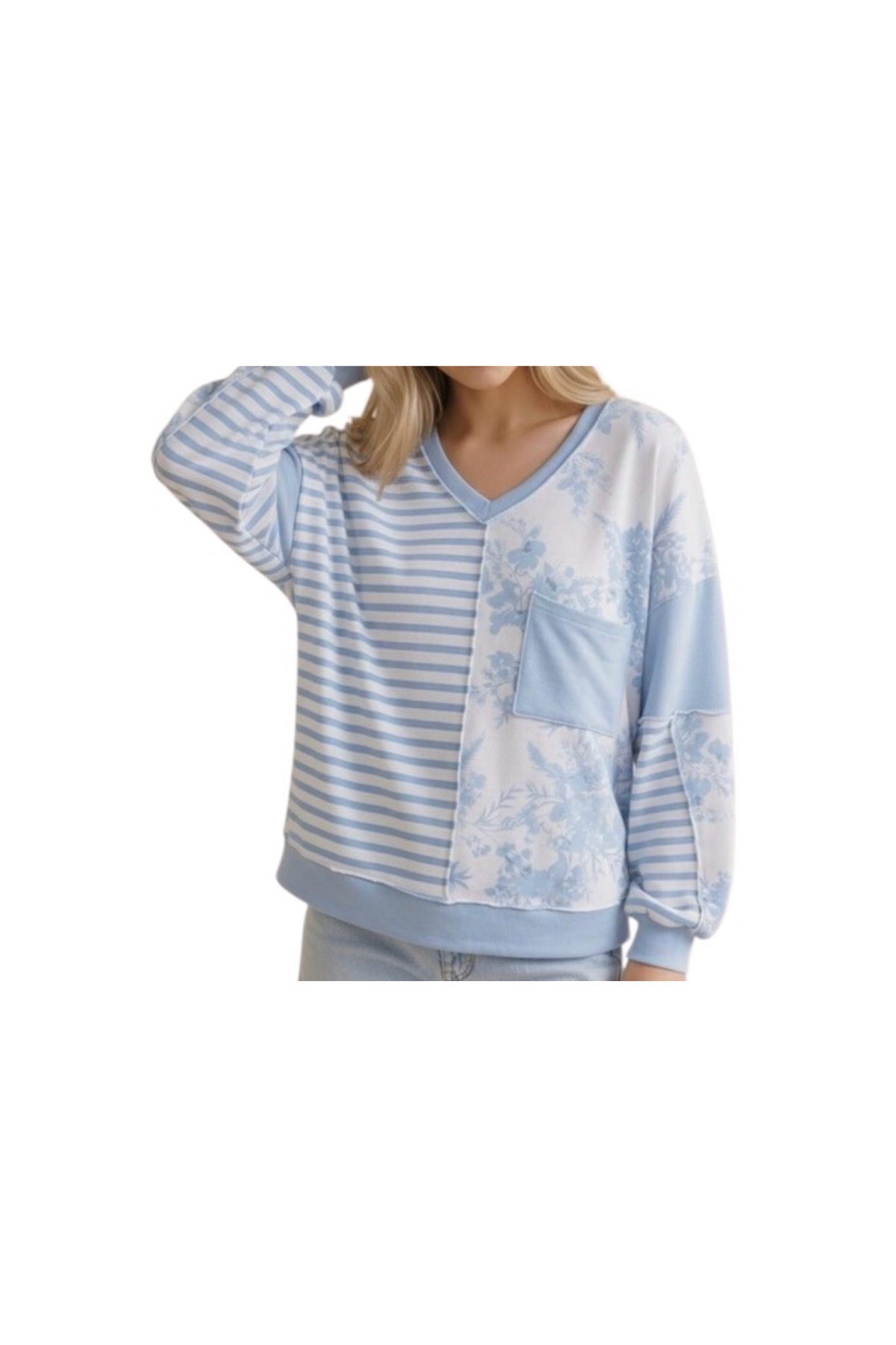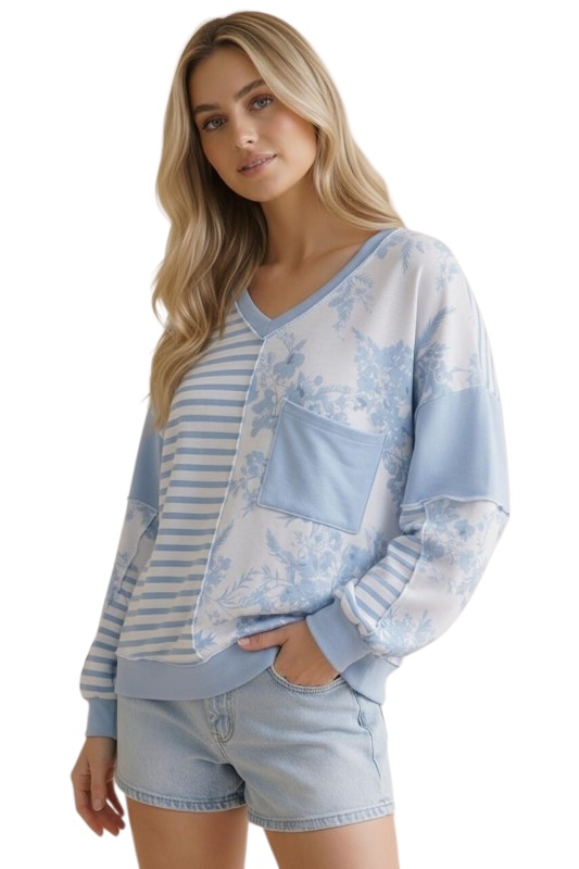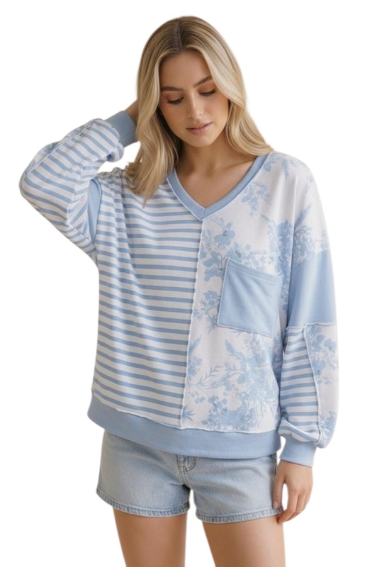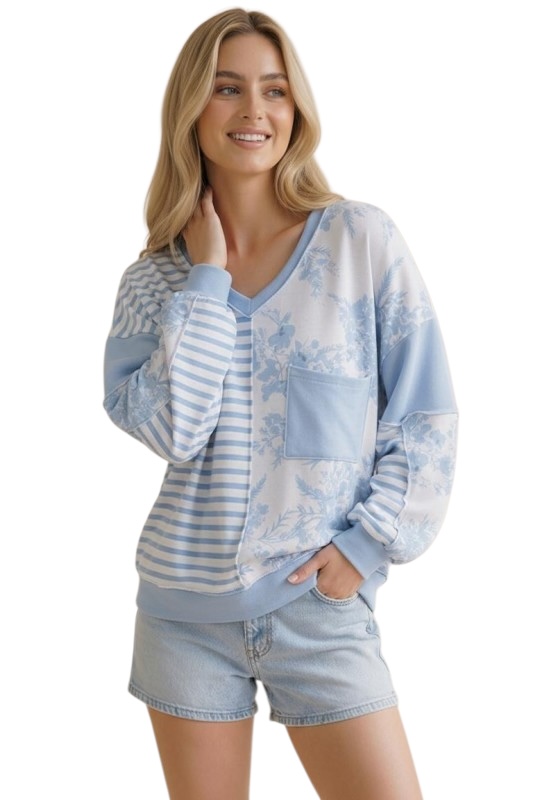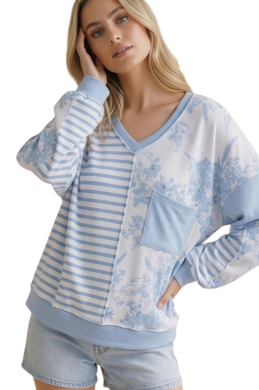 HAPTICS V-NECK FLORAL/STRIPE COLOR BLOCK TOP
