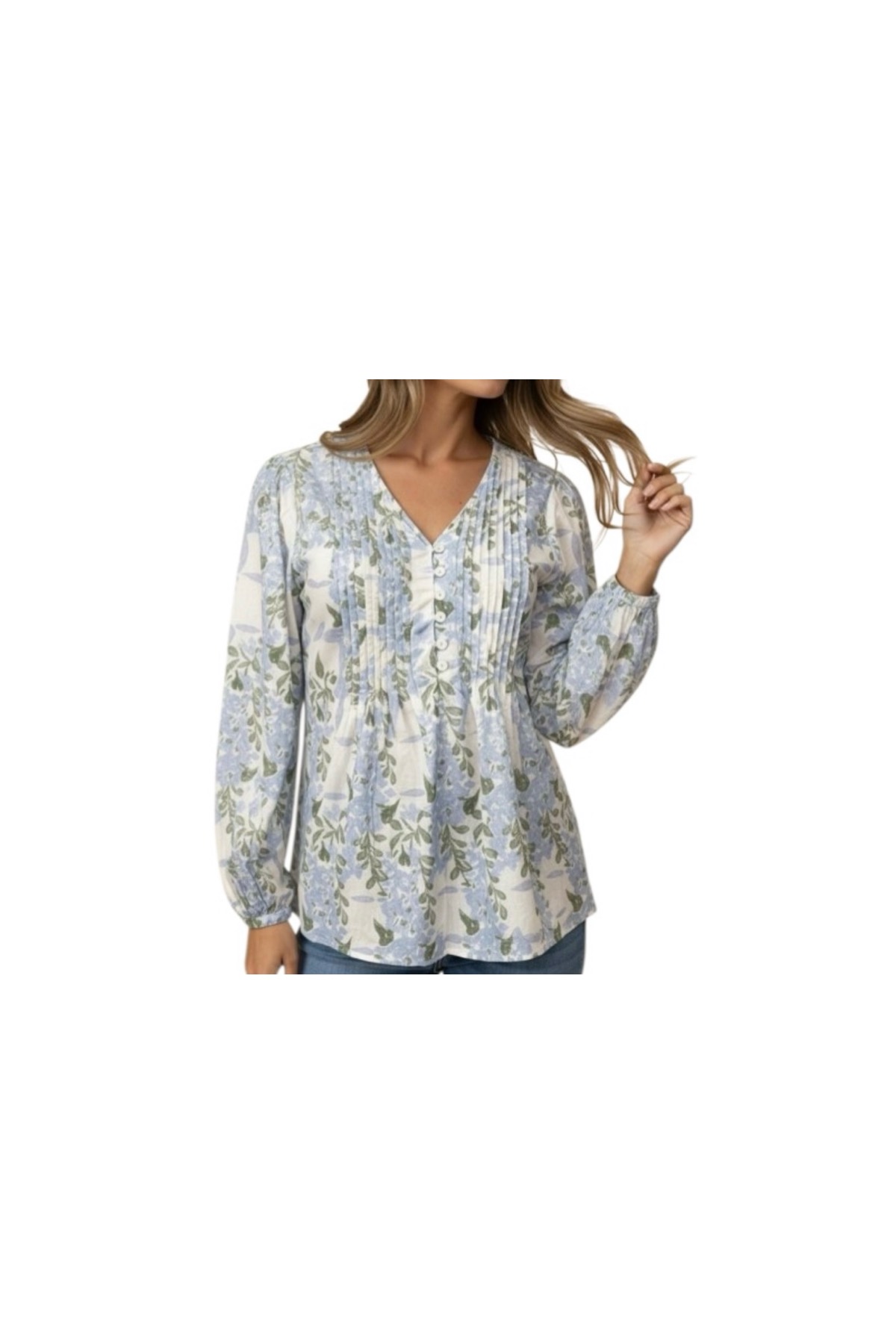 / HAPTICS V-NECK PIN TUCK FLORAL COTTON BLOUSE