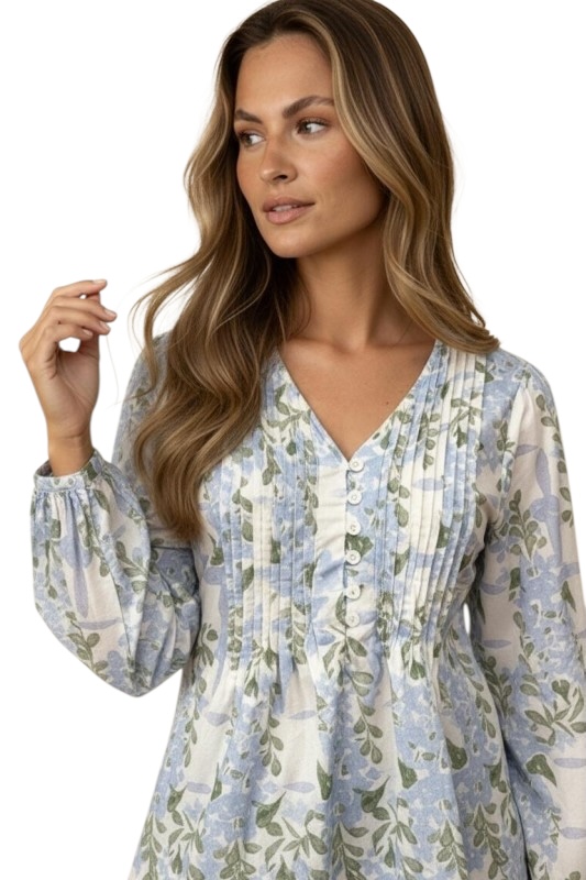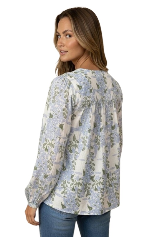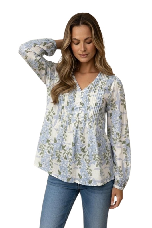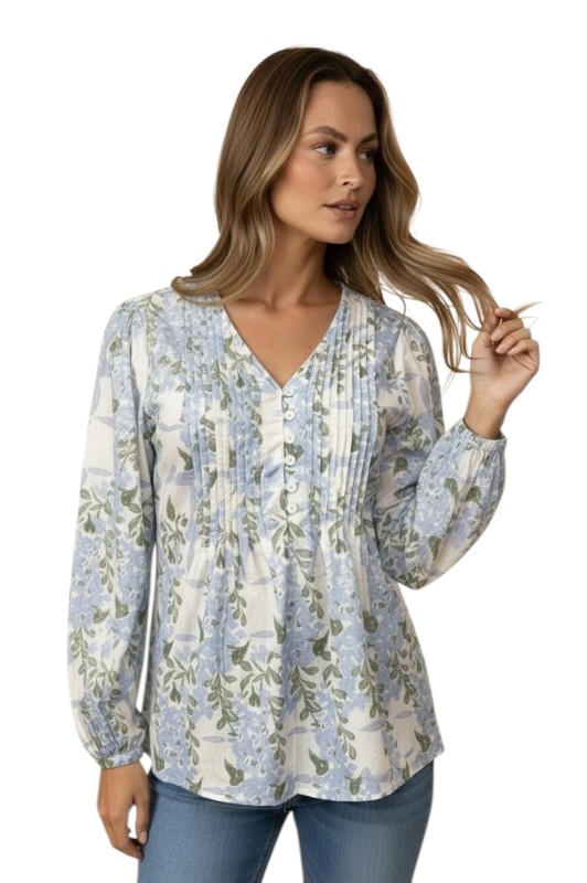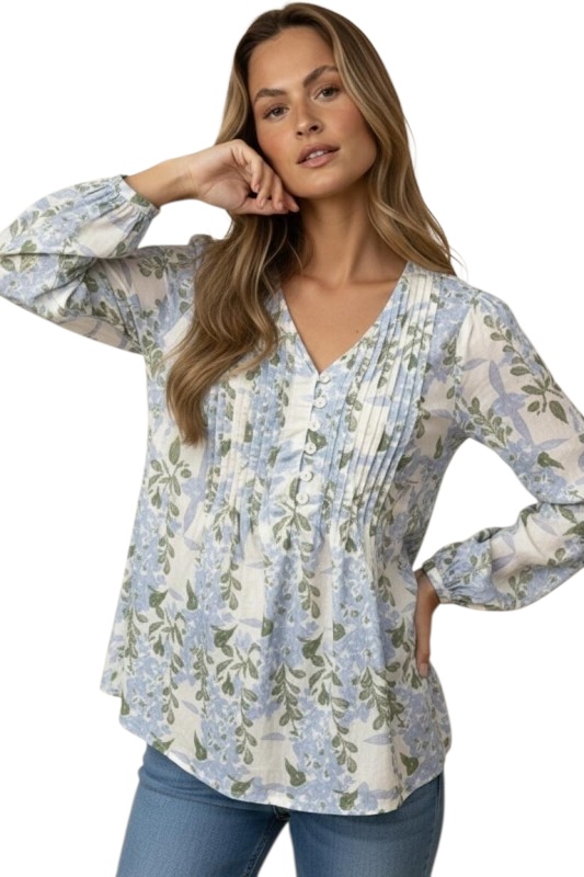HAPTICS V-NECK PIN TUCK FLORAL COTTON BLOUSE