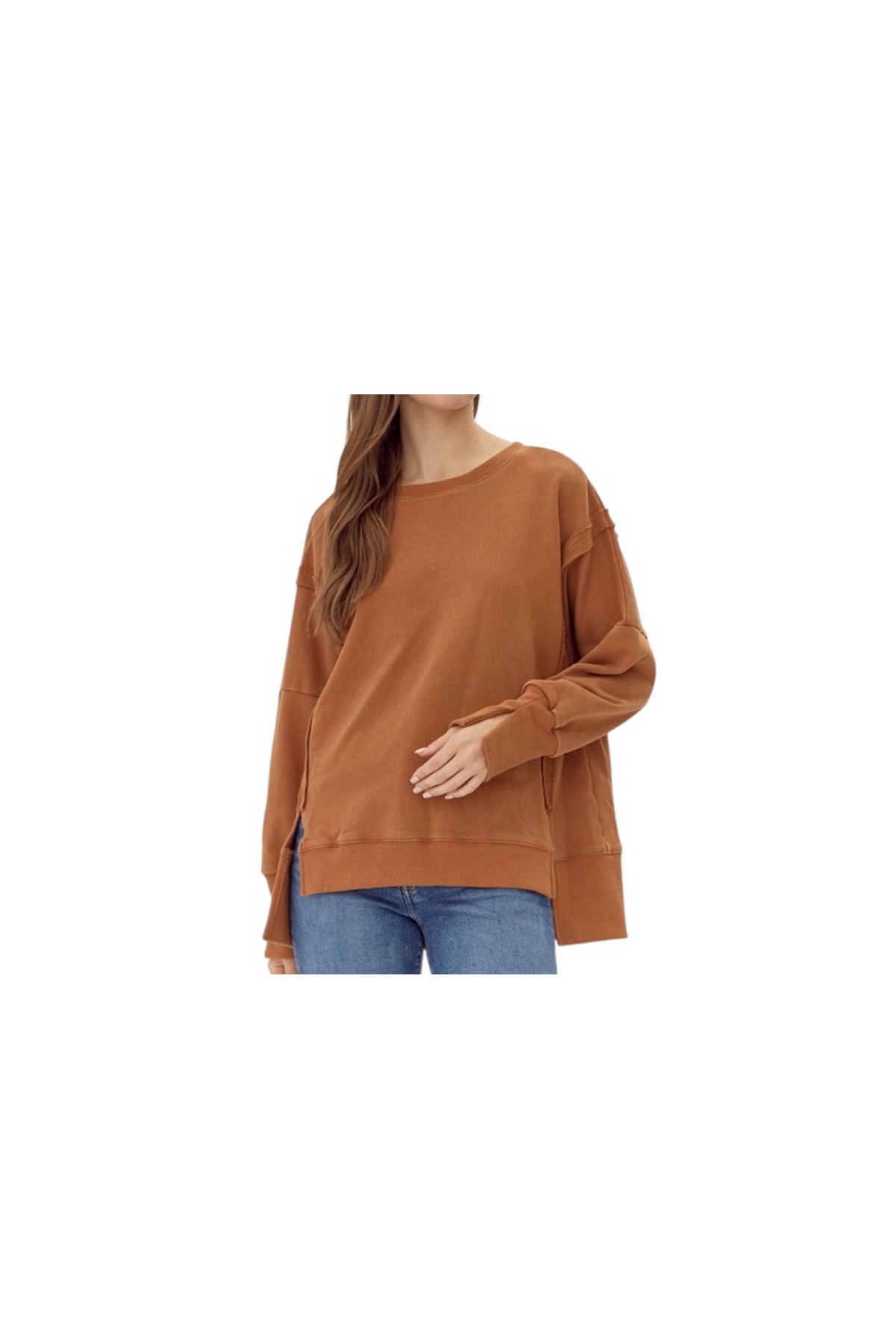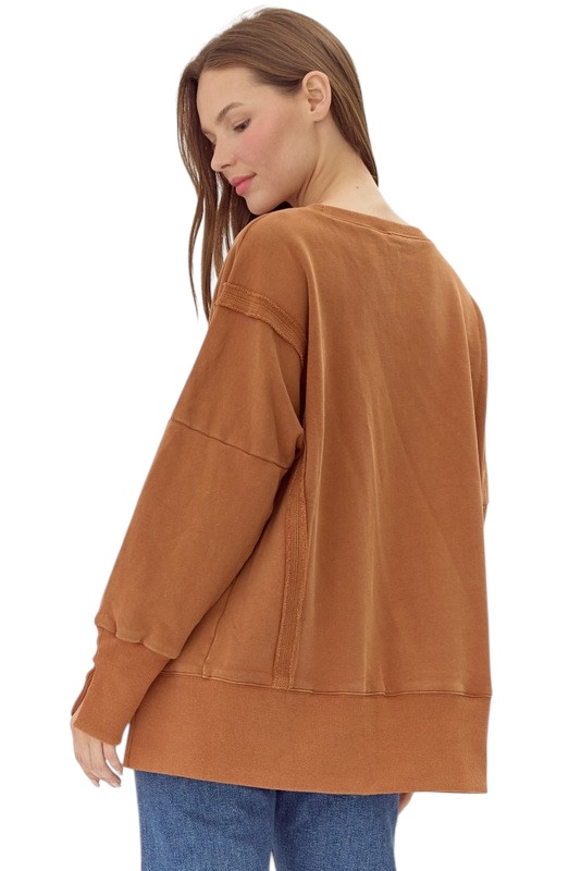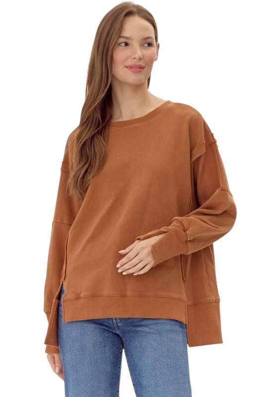 Washing cotton sweatshirts top with U-neck, drop shoulders, long sleeves, wide ribbed hems, side and cuffs slit detail.