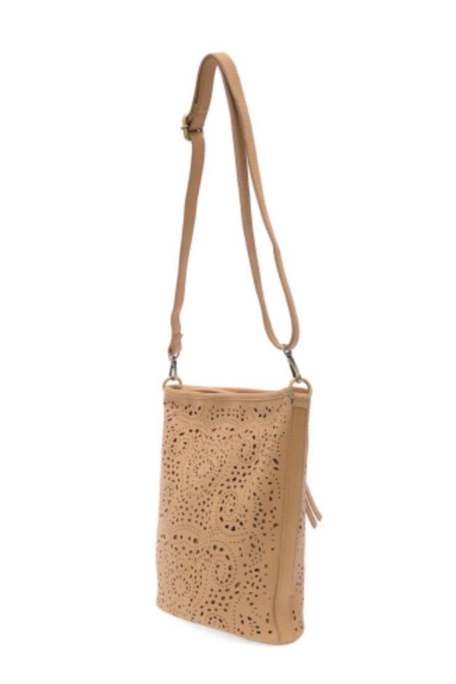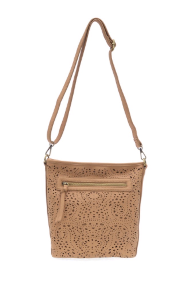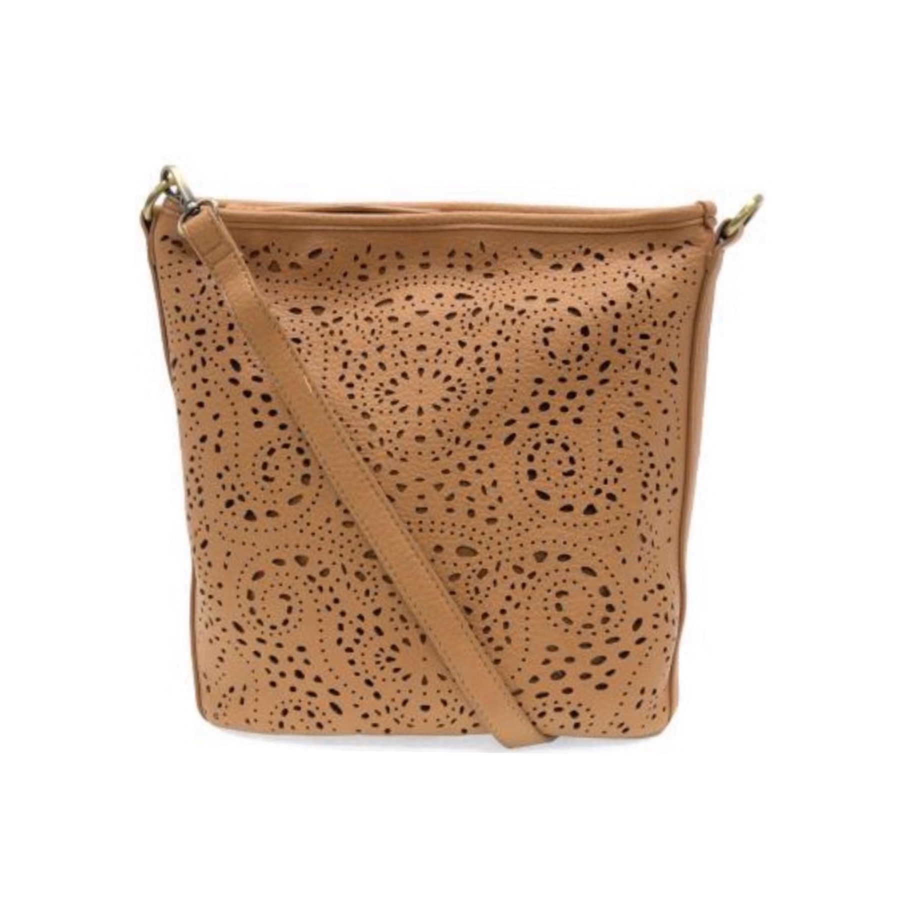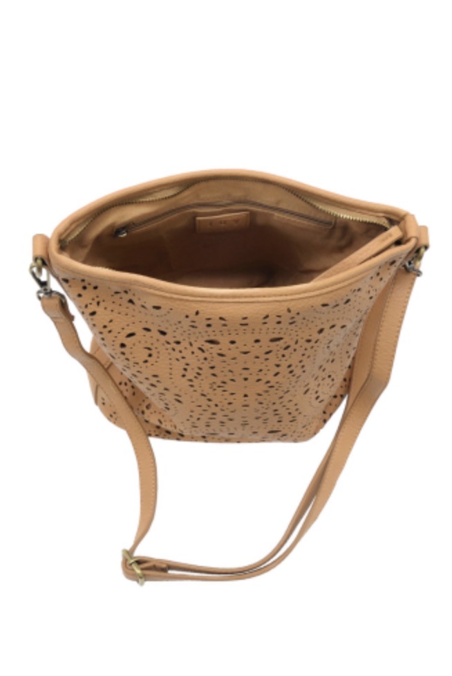 THIS SLOUCHY BUCKET BAG IS FASHIONED IN SOFT VEGAN LEATHER ACCENTED WITH A FEMININE, DELICATE LASER CUT PATTERN REMINISCENT OF EYELET LACE FOR A LUXE BOHO LOOK. A TOP ZIP CLOSURE KEEPS YOUR BELONGINGS SECURE WITH ENOUGH SPACE FOR EVERYTHING YOU NEED TO CARRY ON A DAILY BASIS. THE BACK ZIPPER POCKET KEEPS YOUR PHONE OR KEYS IN EASY REACH, AND THE ADJUSTABLE SHOULDER STRAP CAN BE WORN AS A CROSSBODY OR SHOULDER BAG.