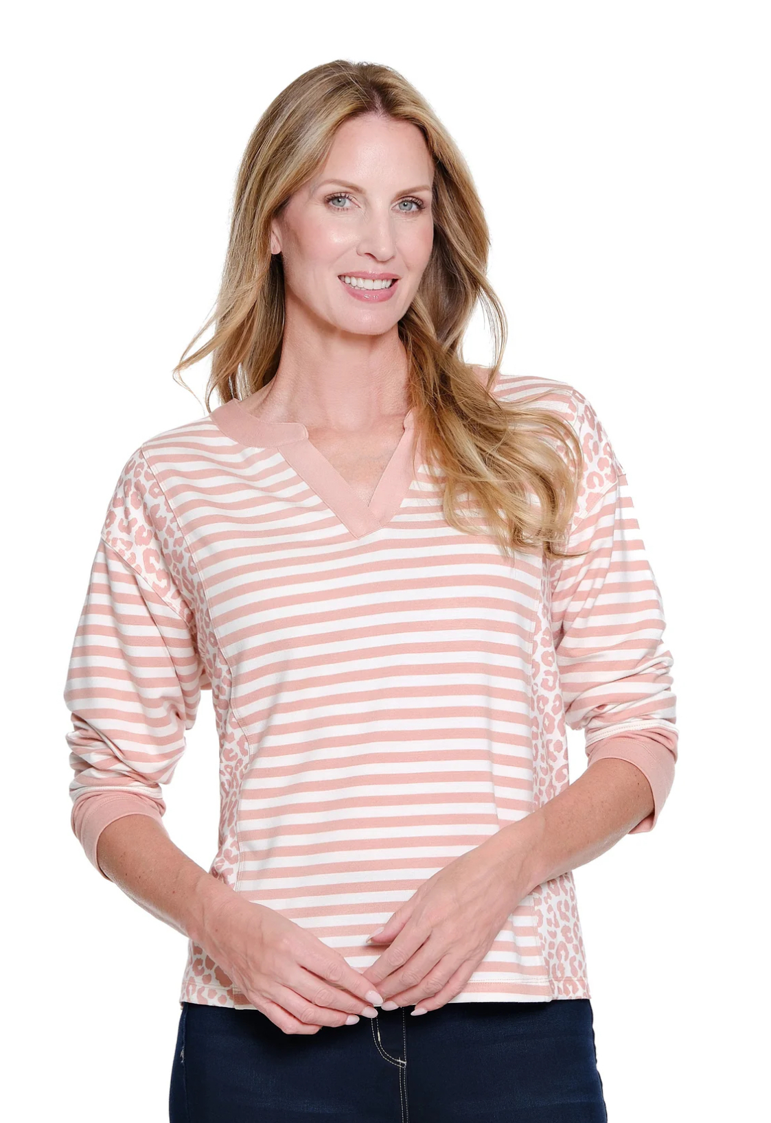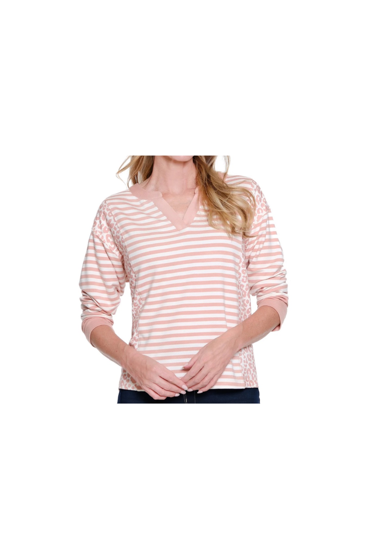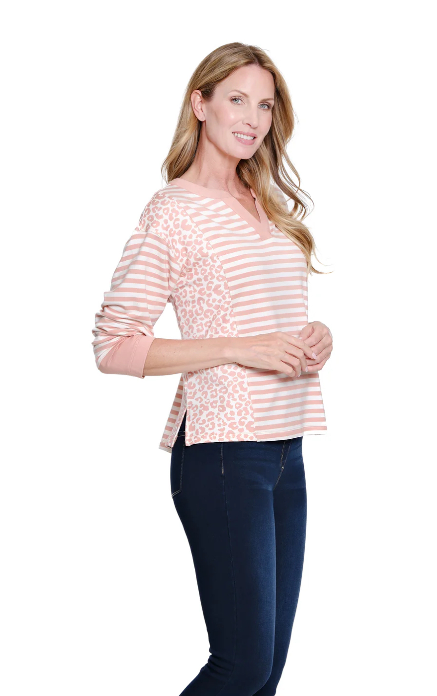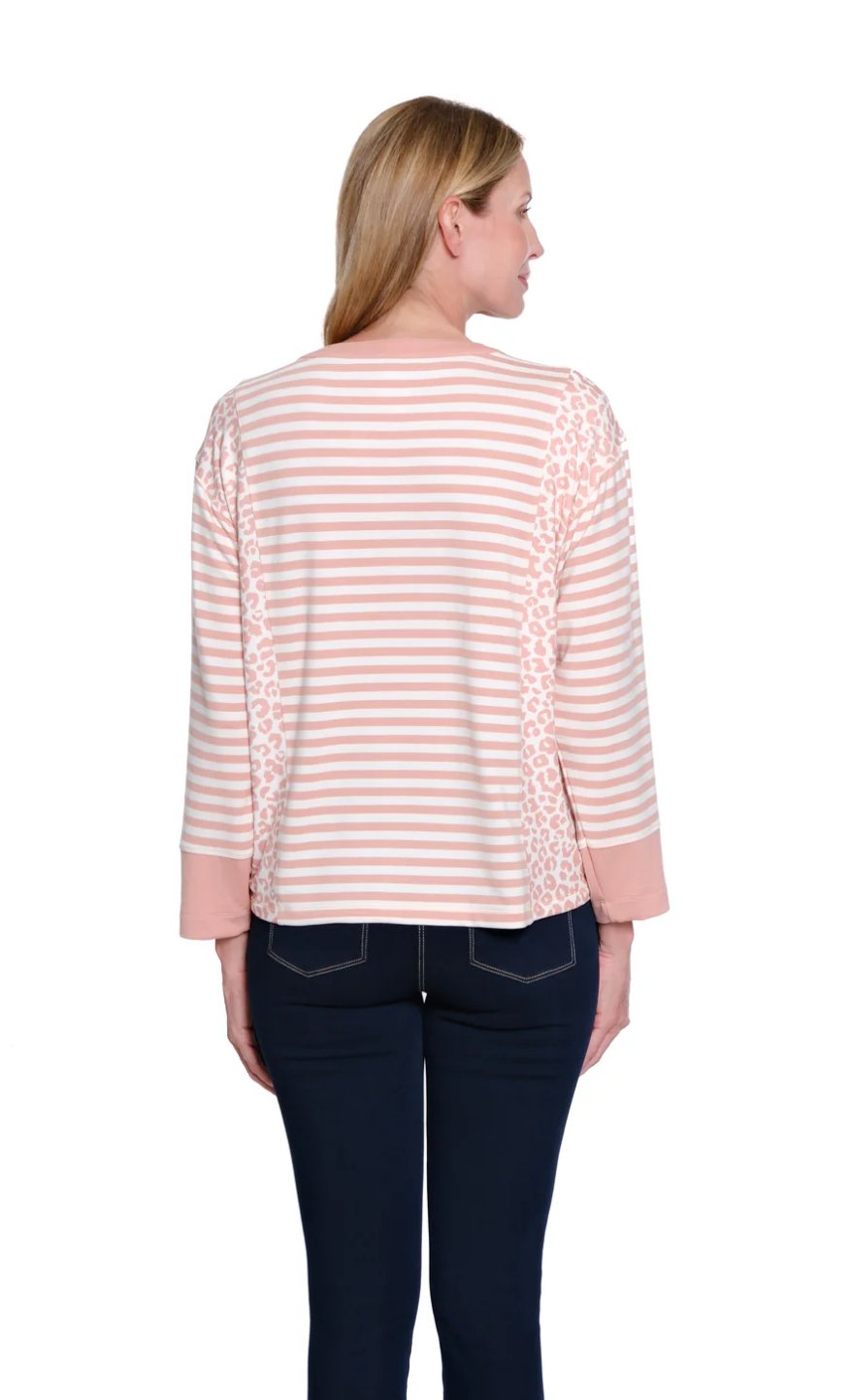 MULTIPLES 3/4 SLEEVE STRIPE/LEOPARD KNIT TOP