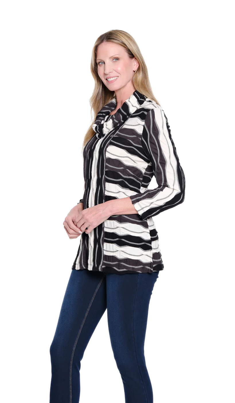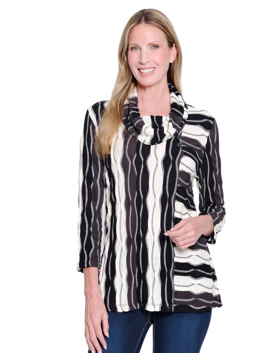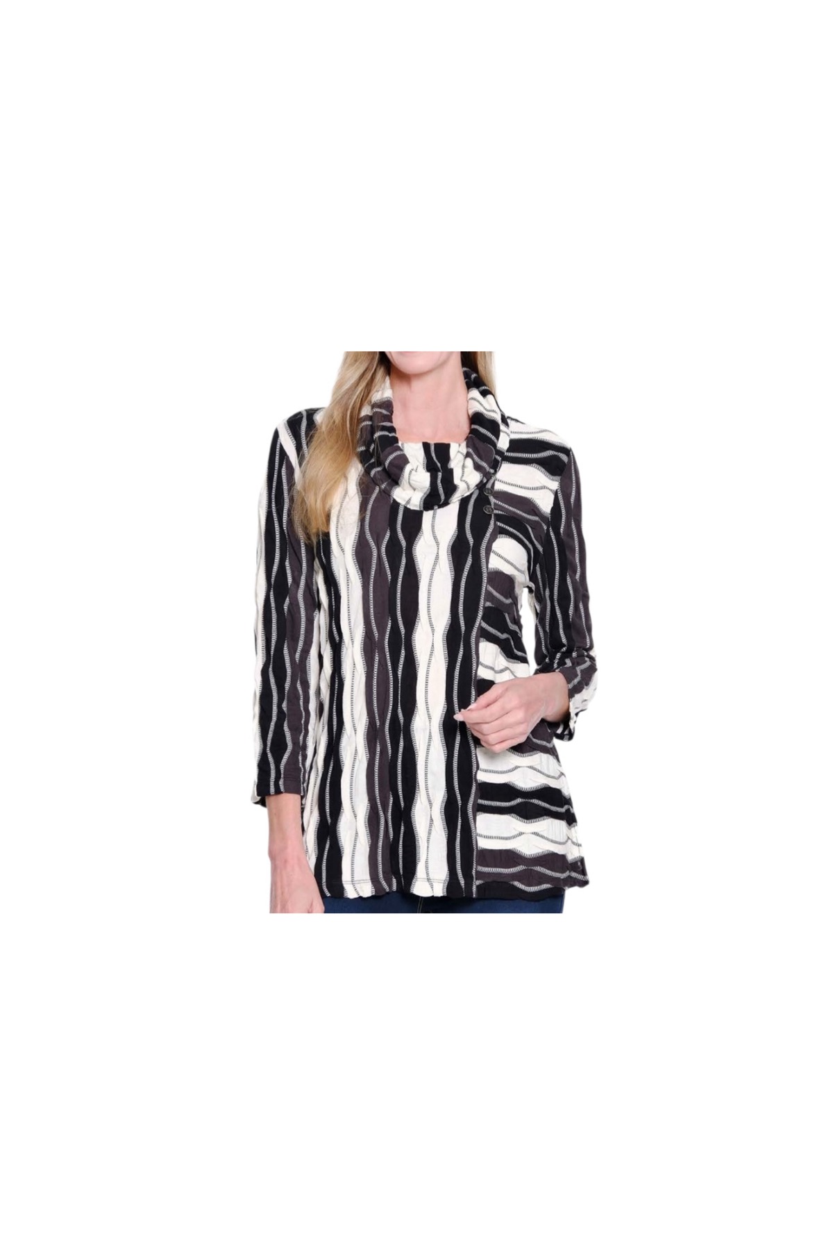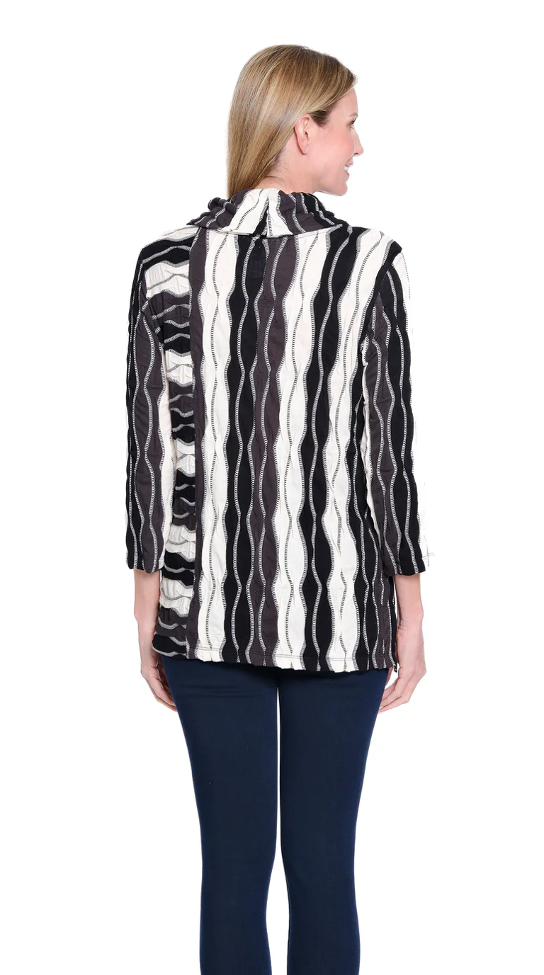 Soft texture meets modern style in this wavy stripe jacquard knit top. Designed with a relaxed cowl neckline and side vents for movement, it’s an easy way to elevate your everyday look. Three front buttons and 3/4 sleeves add just the right touch of detail and versatility.