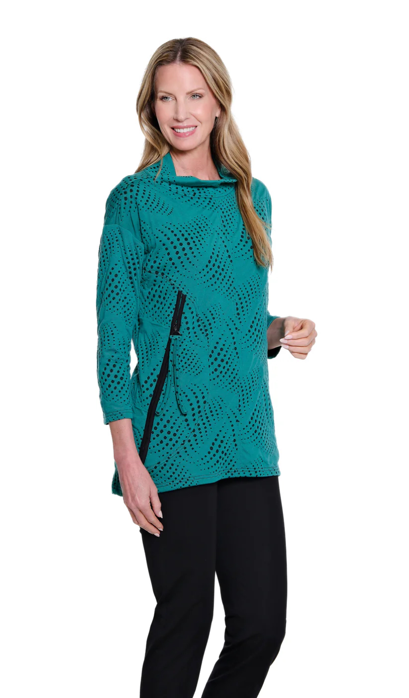 Stay comfy while keeping your style laid-back with this long-sleeve jacquard knit top. Designed with an easy drop-shoulder fit and a relaxed cowl collar, it drapes effortlessly for an everyday look you’ll love. The playful dot pattern adds fun texture, while the hi-lo hem and two front pockets give it that perfect casual vibe. Made from a soft, stretchy poly-spandex double knit, it’s ideal for tossing on with leggings or jeans.