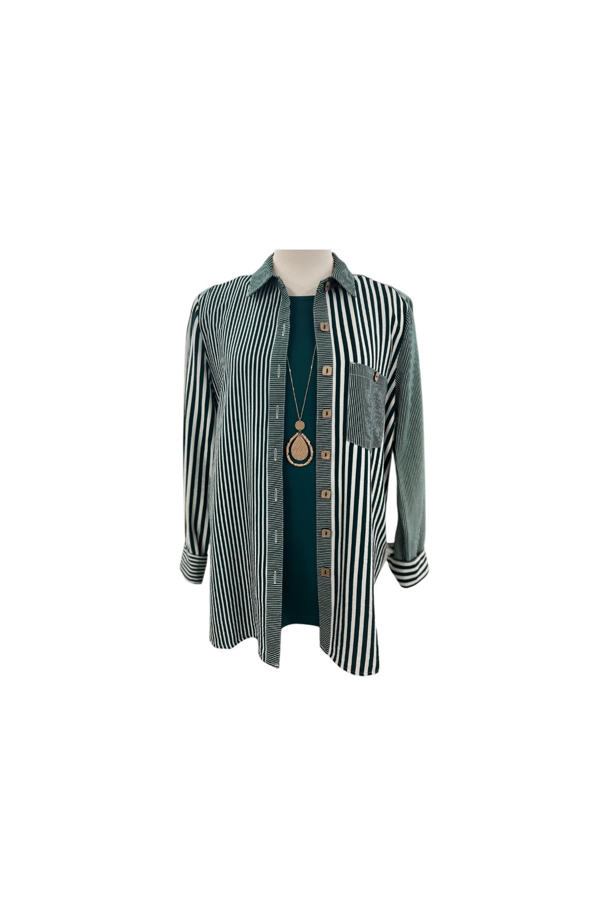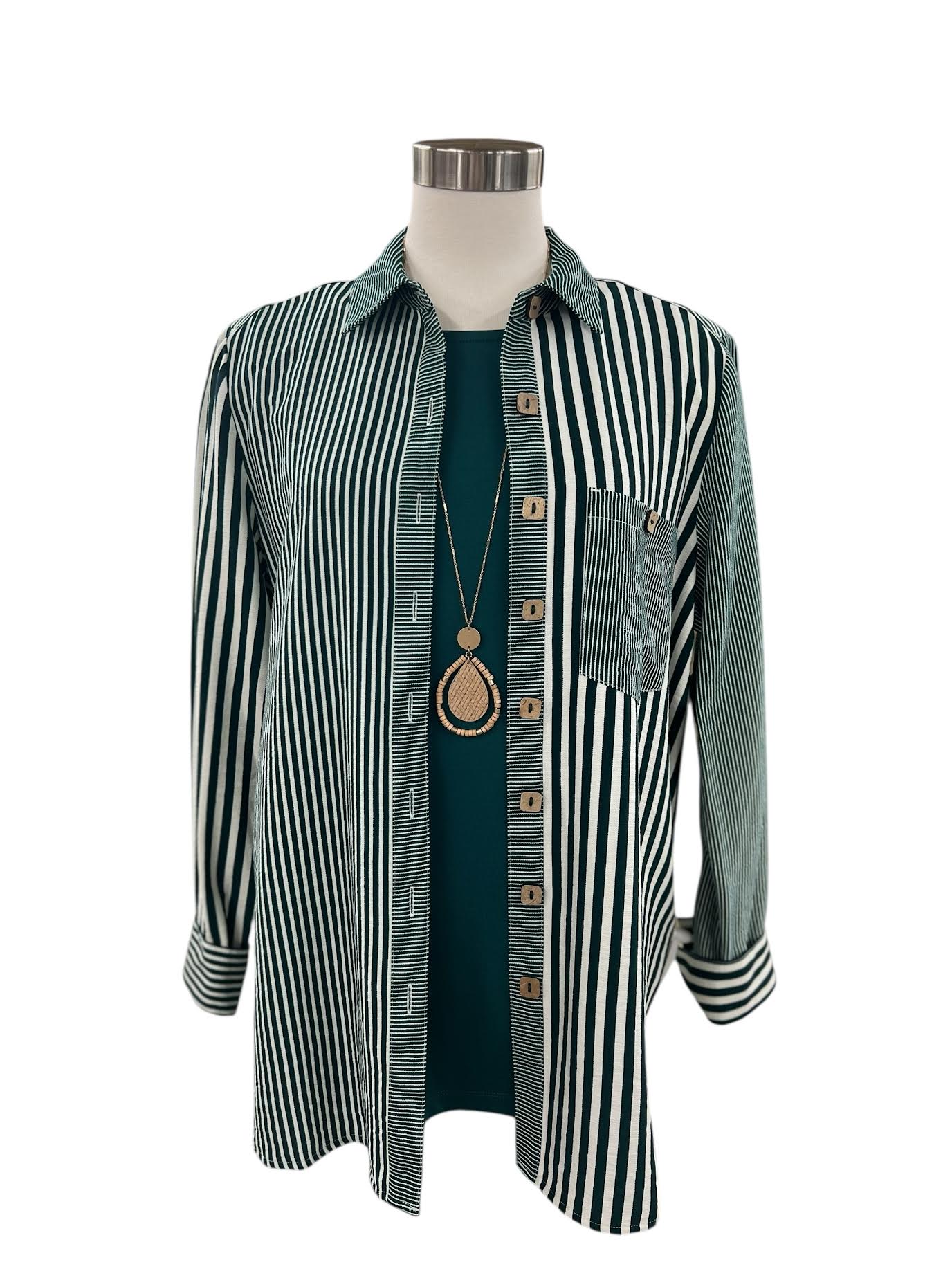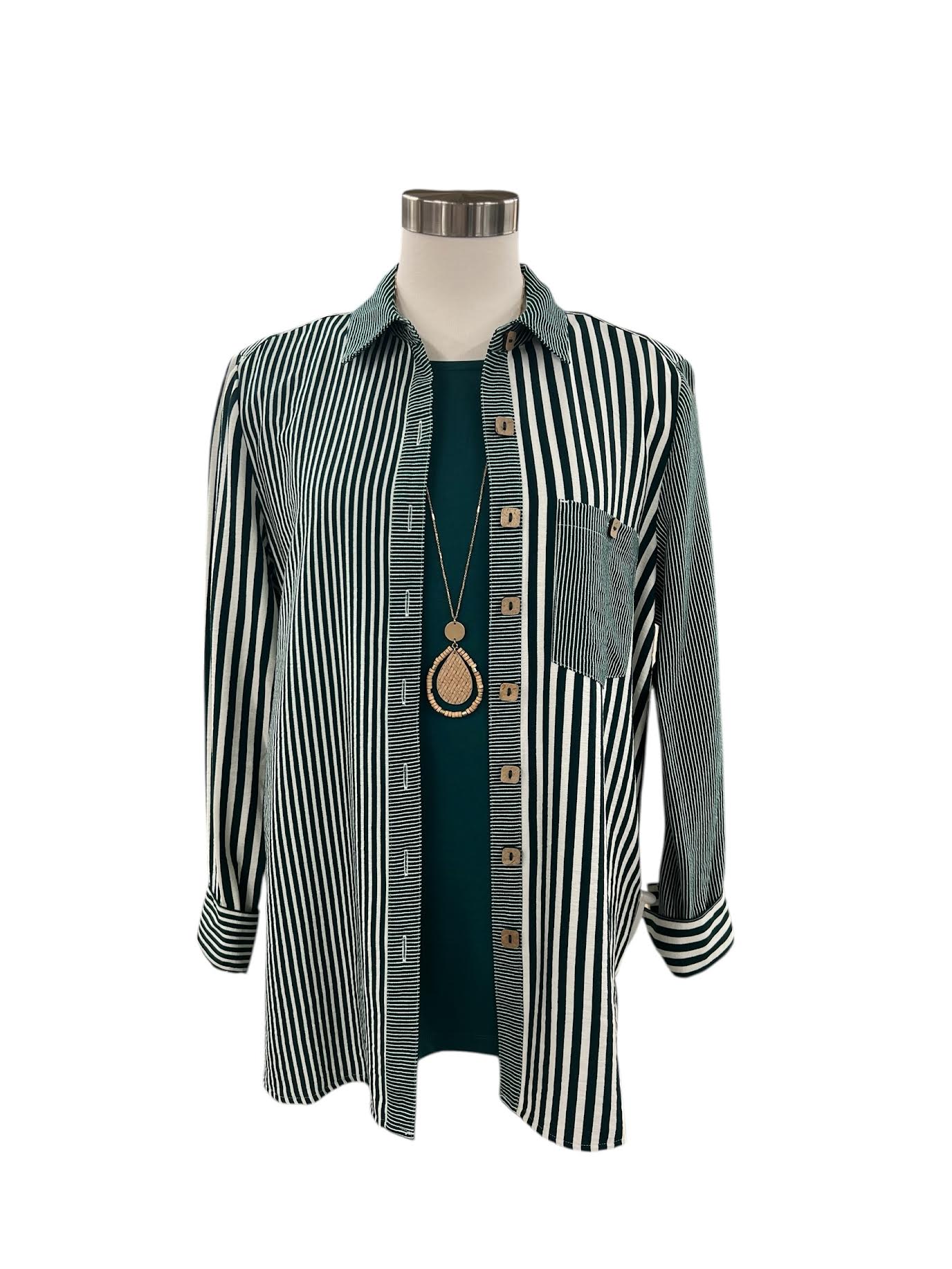 MULTIPLES DEEP GREEN BUTTON FRONT STRIPE SHIRT