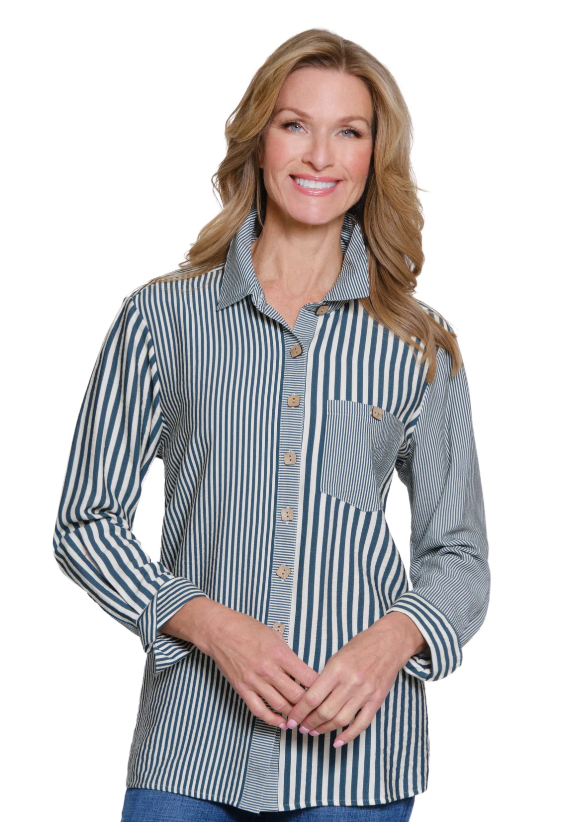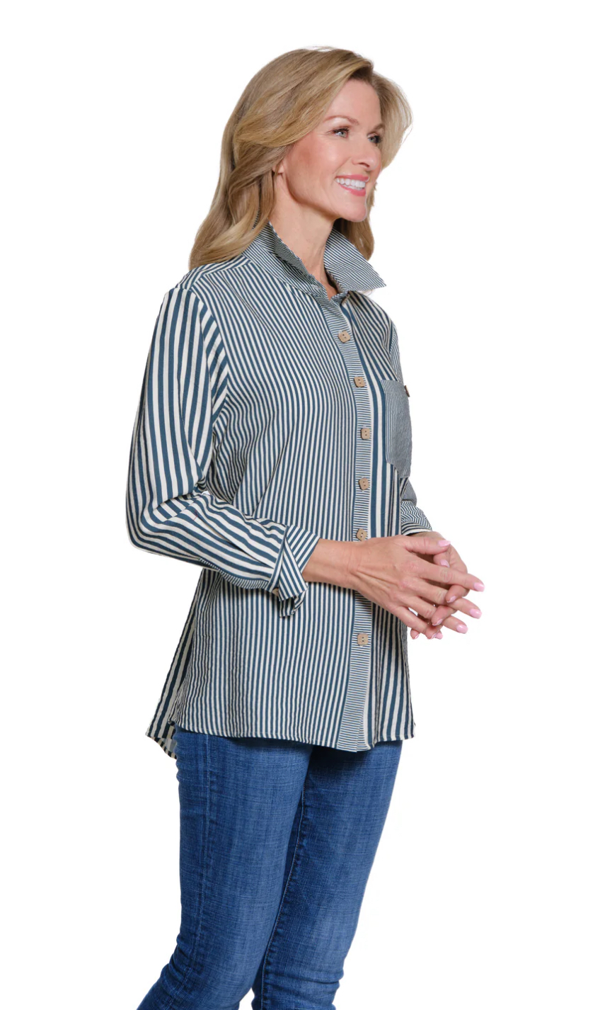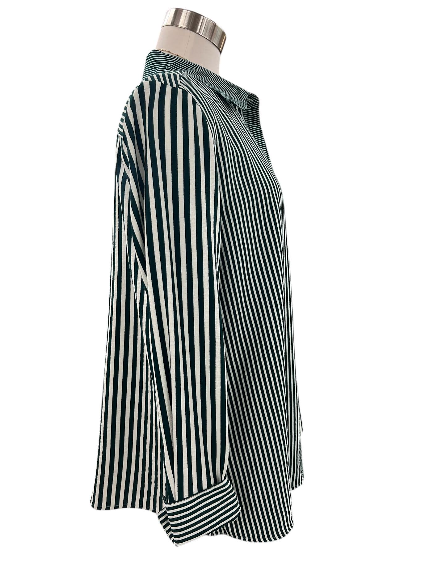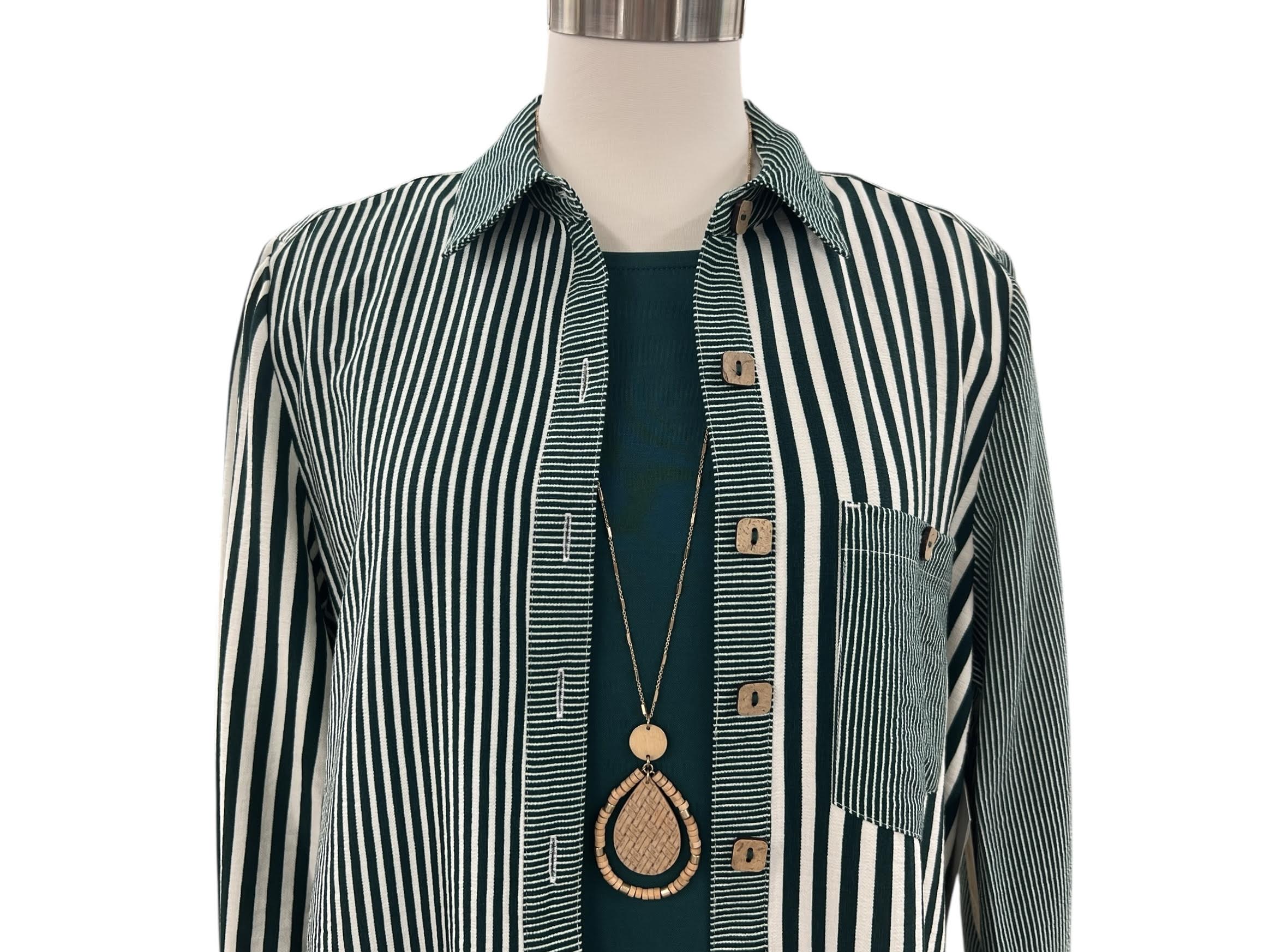 MULTIPLES DEEP GREEN BUTTON FRONT STRIPE SHIRT
