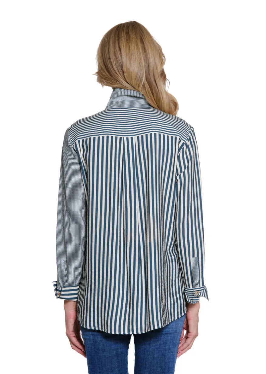 Classic meets casual in this effortlessly polished striped shirt. Designed with a one-button cuff that turns up for added flair, this lightweight woven essential features a crisp button front and long sleeves—perfect for dressing up or down.