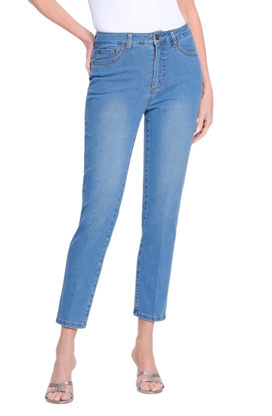 Cleanly tailored with timeless appeal, this ankle-length jean features a classic zip-front closure and traditional five-pocket styling for everyday versatility. The streamlined silhouette offers a polished fit, while the cotton-spandex blend provides comfortable stretch and ease of movement. A dependable denim essential designed for refined, effortless wear.