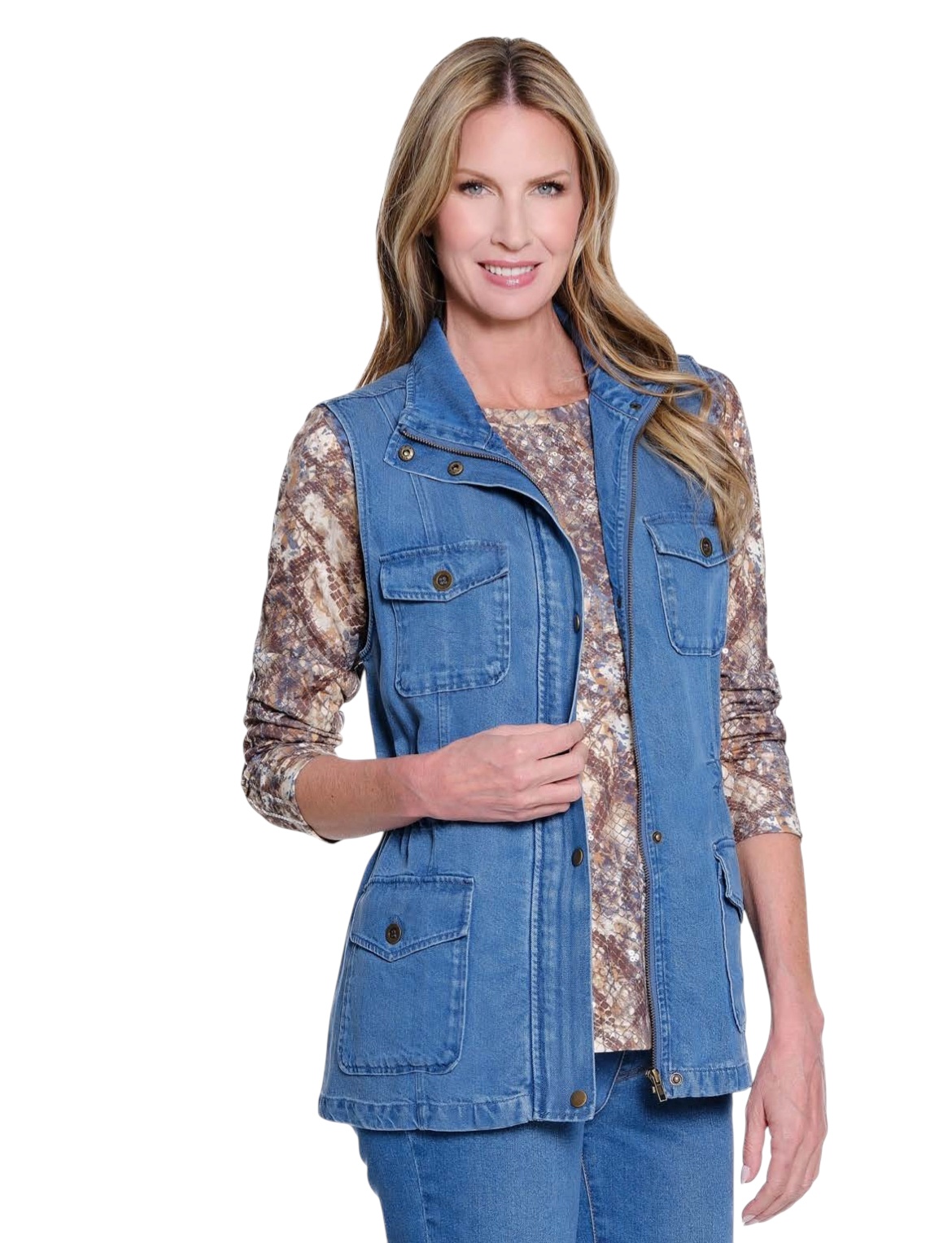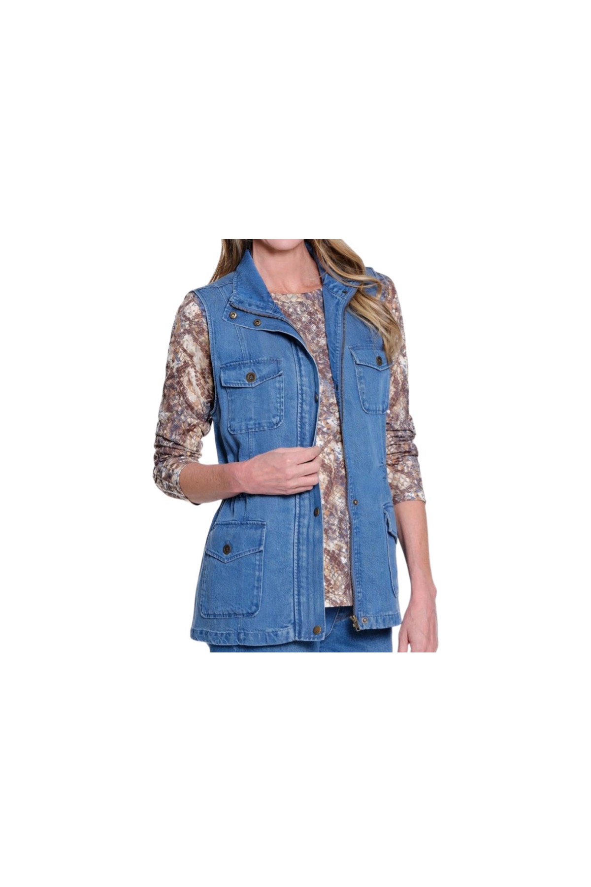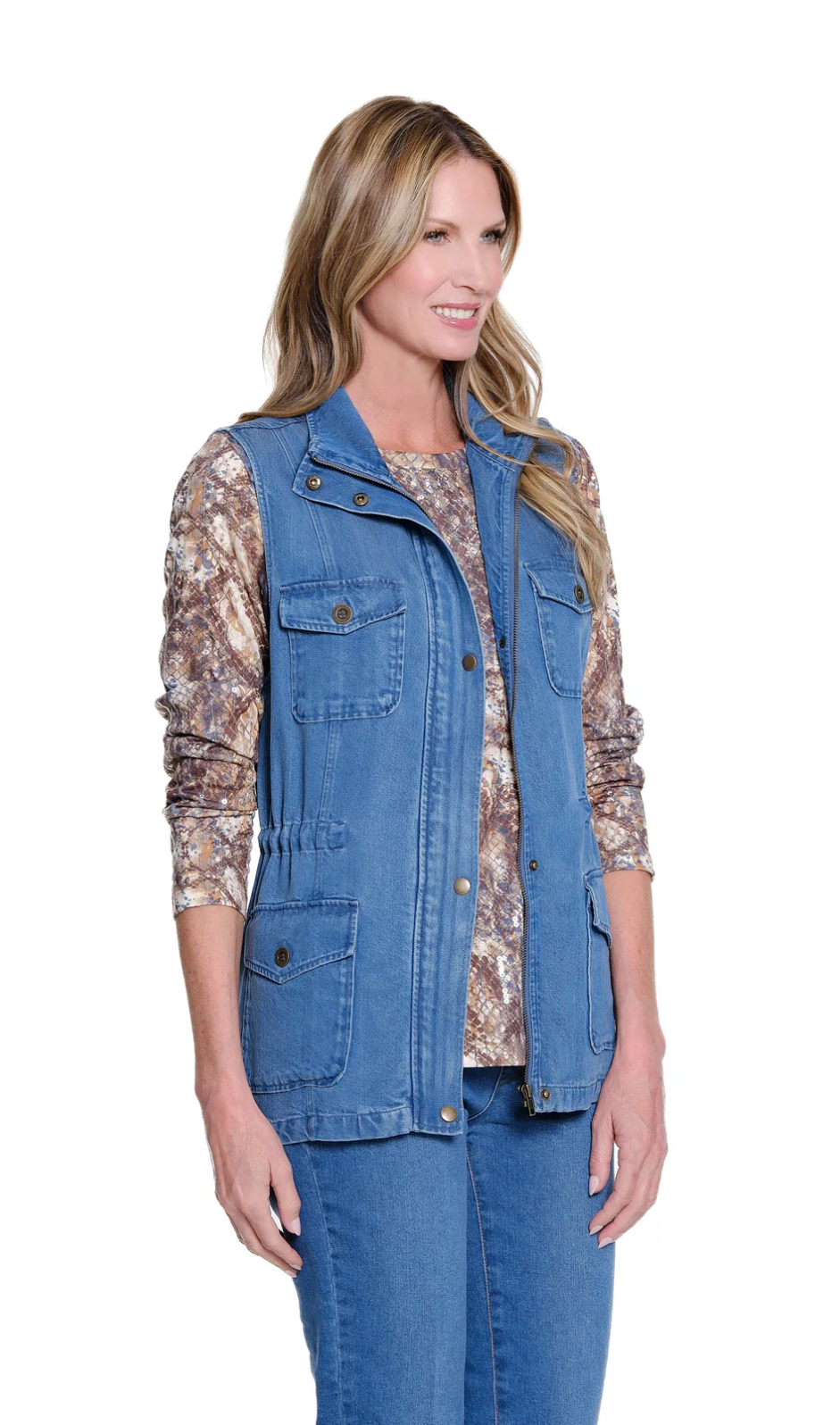 Utility meets effortless style in this slub denim vest. Designed with a snap and hidden zip front, four functional pockets, and an adjustable drawstring waist, it offers both practicality and a flattering fit. Made from soft, breathable lyocell, this vest is perfect for layering through the seasons.
