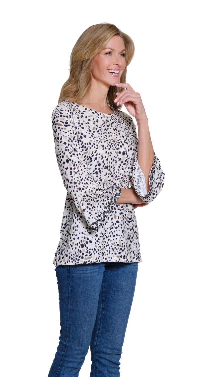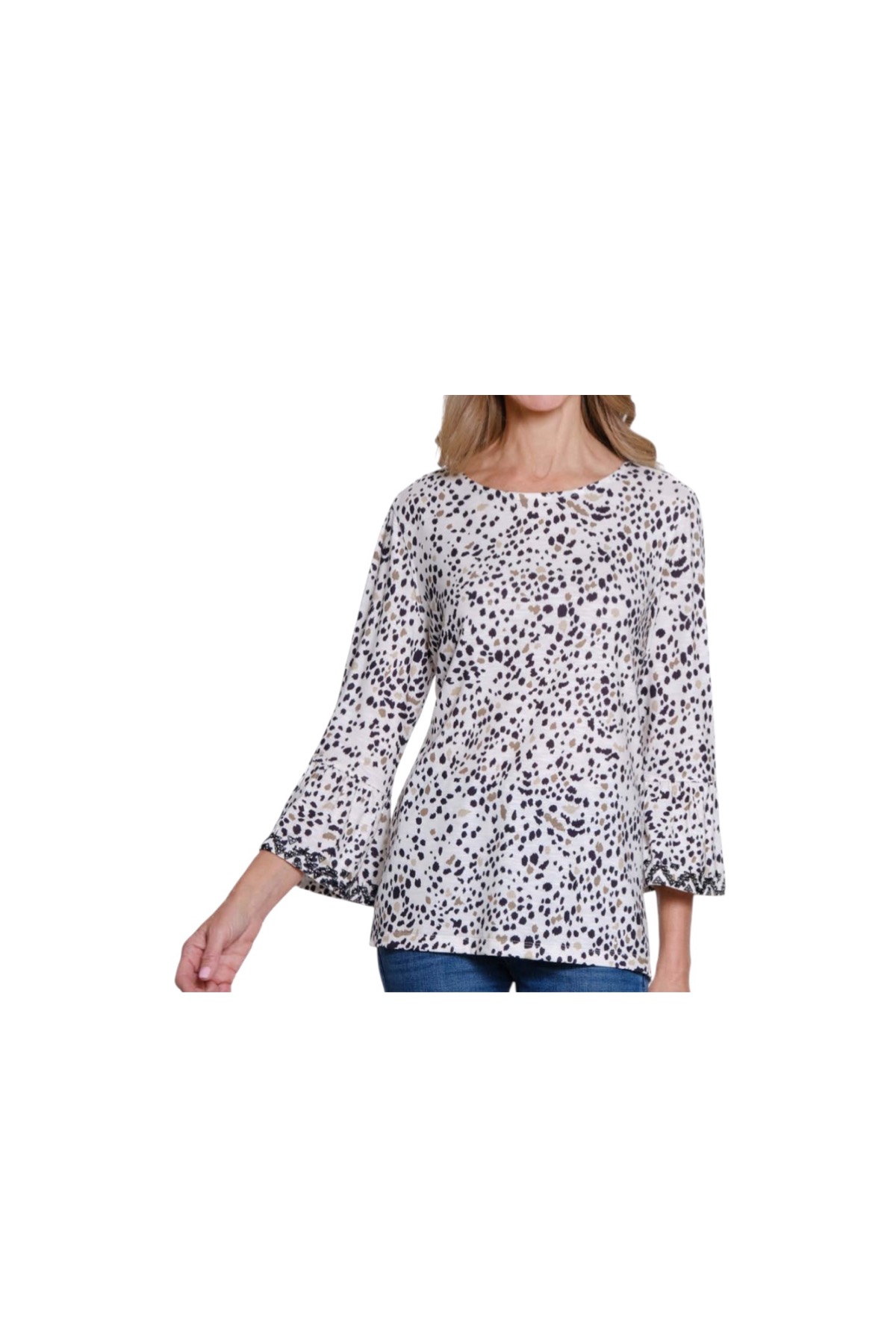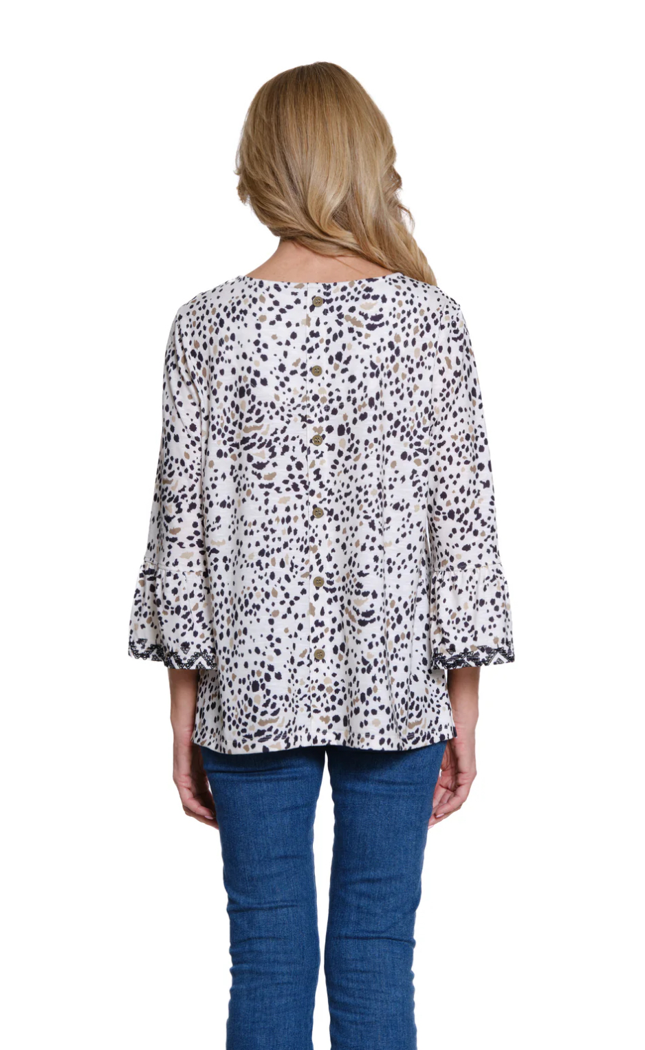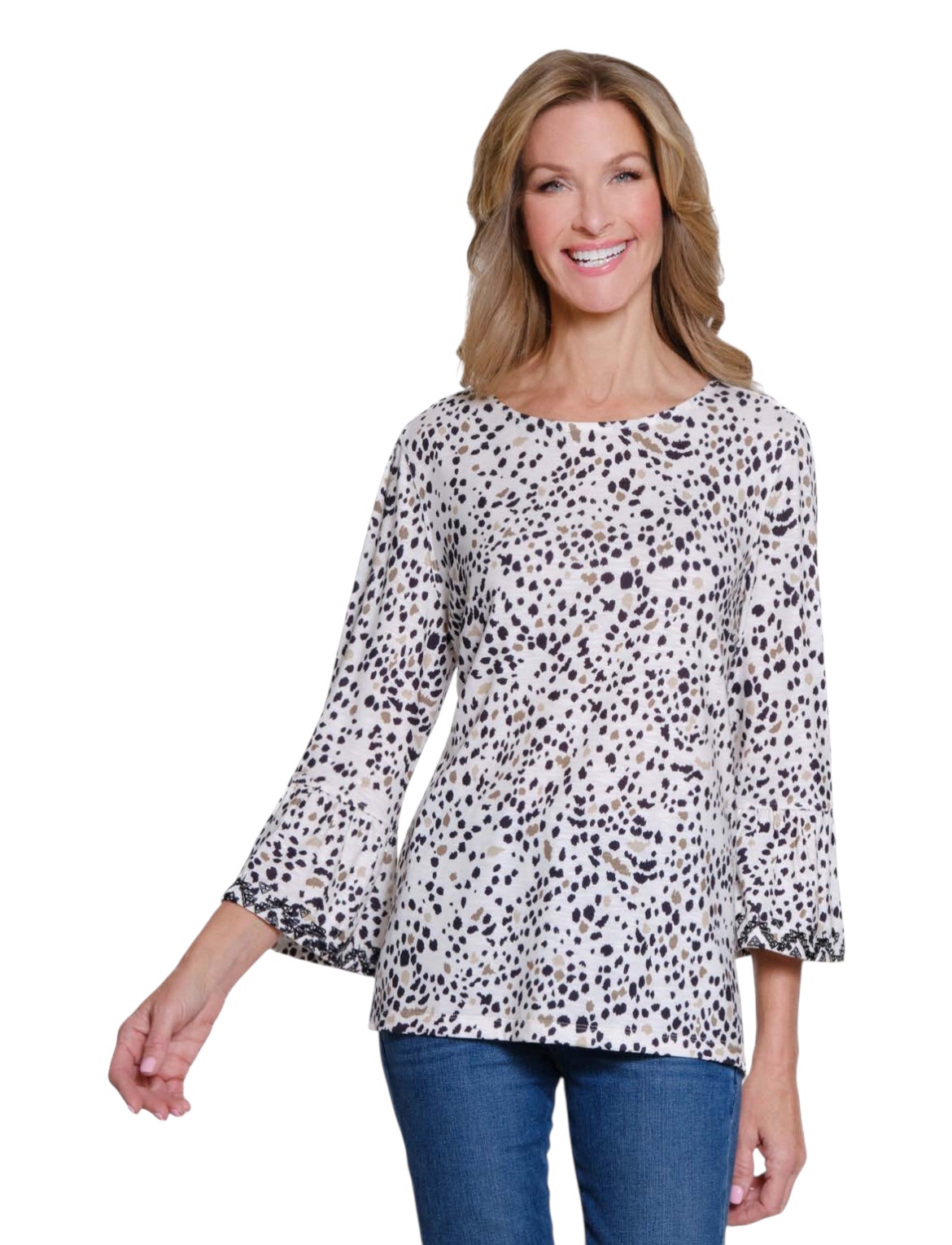 Soft, stretchy, and effortlessly stylish, this slub knit top features playful flounce sleeves and a faux button back placket for subtle detail. The crew neckline and allover print make it an easy, versatile choice for everyday wear.