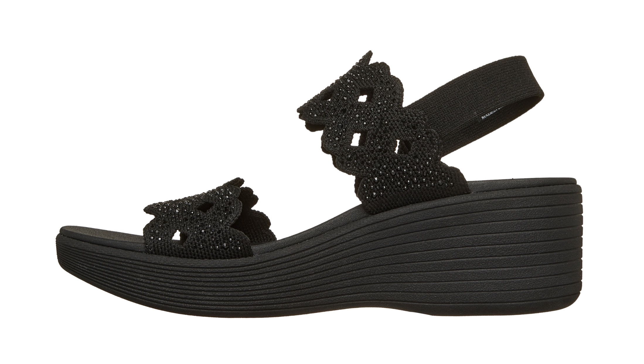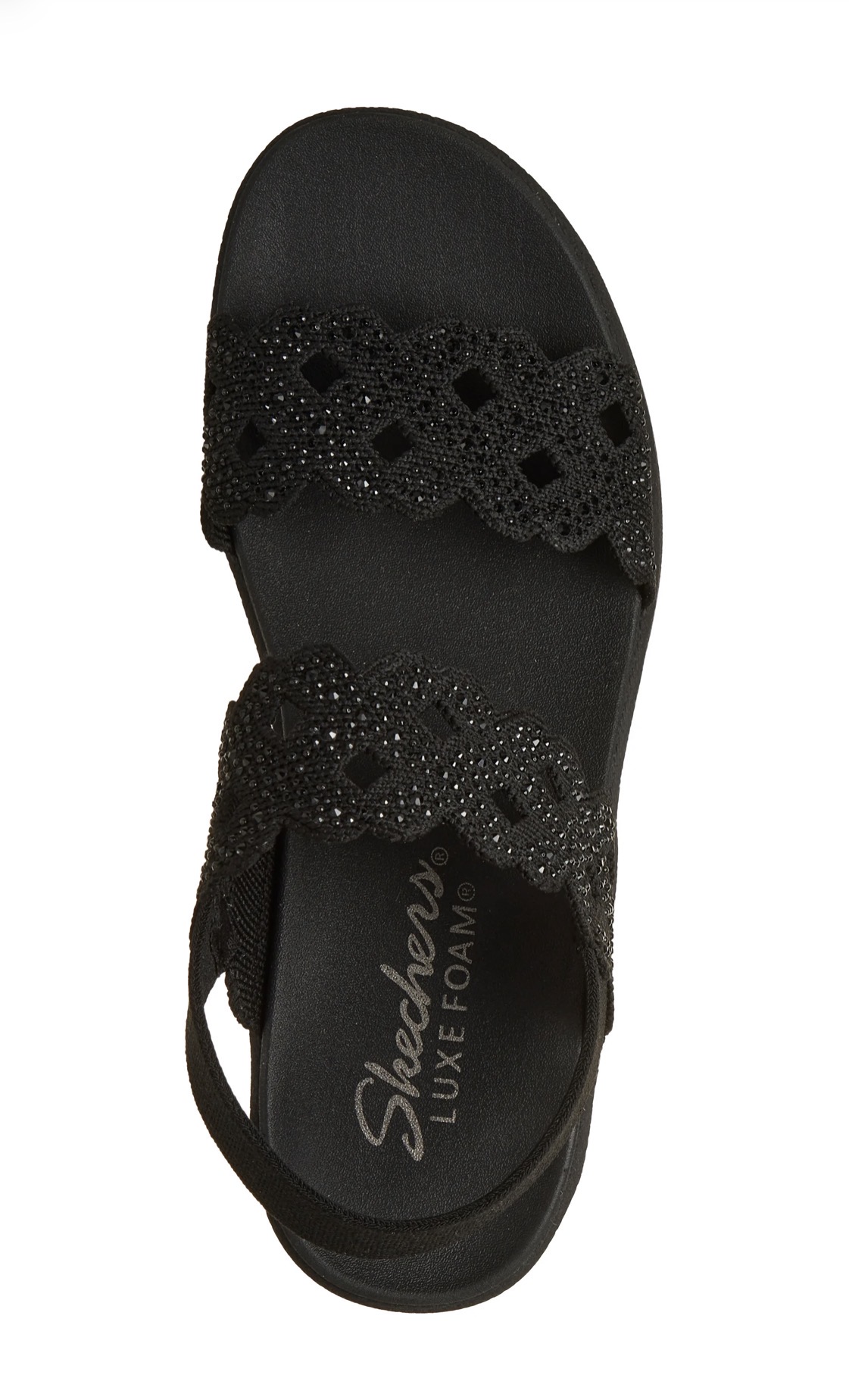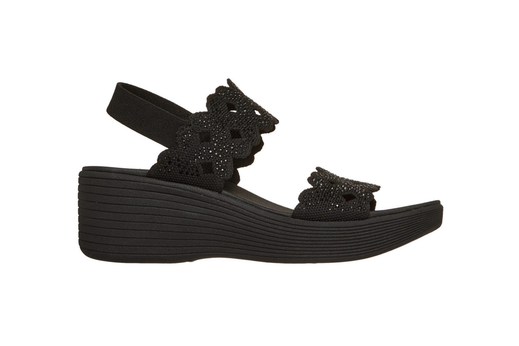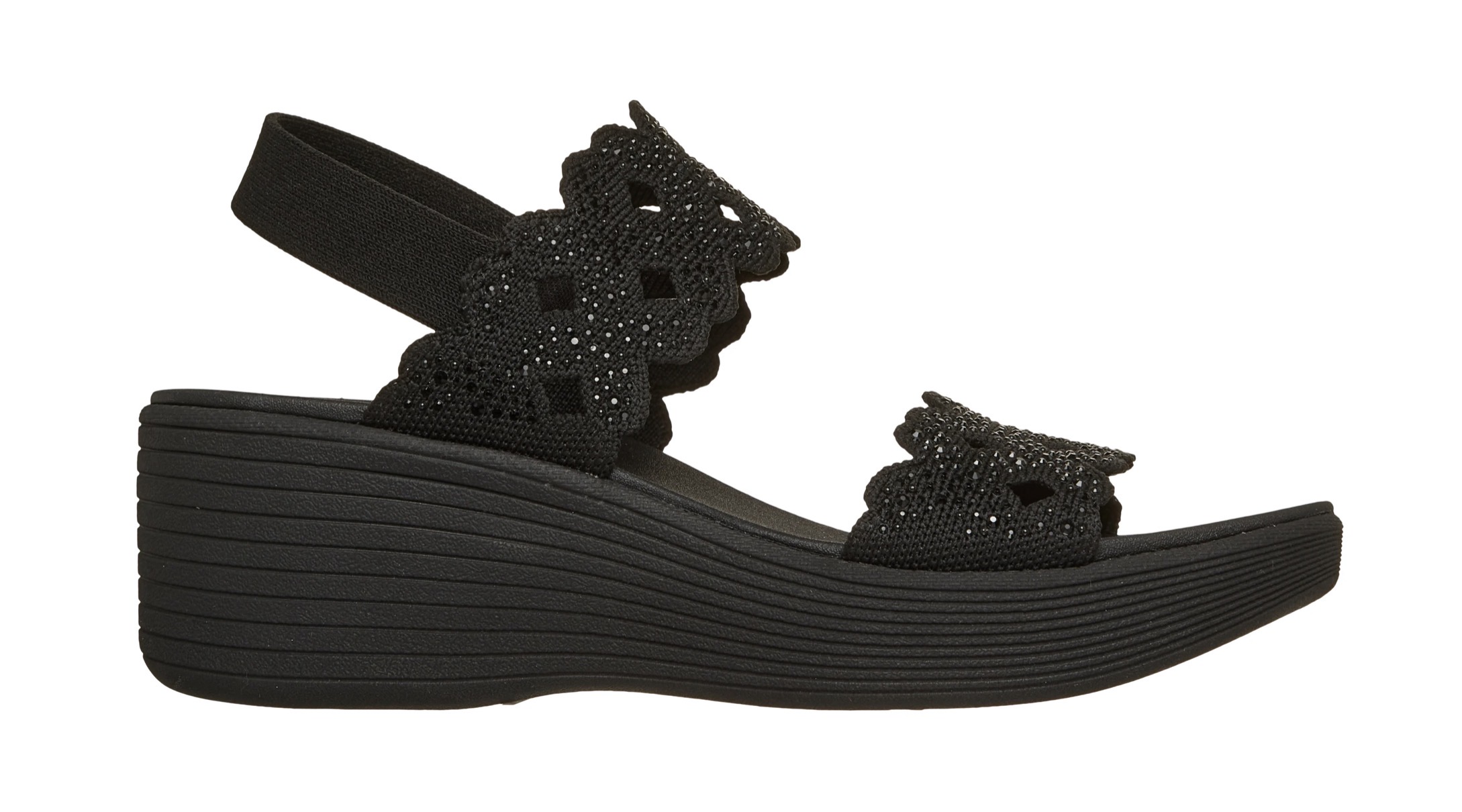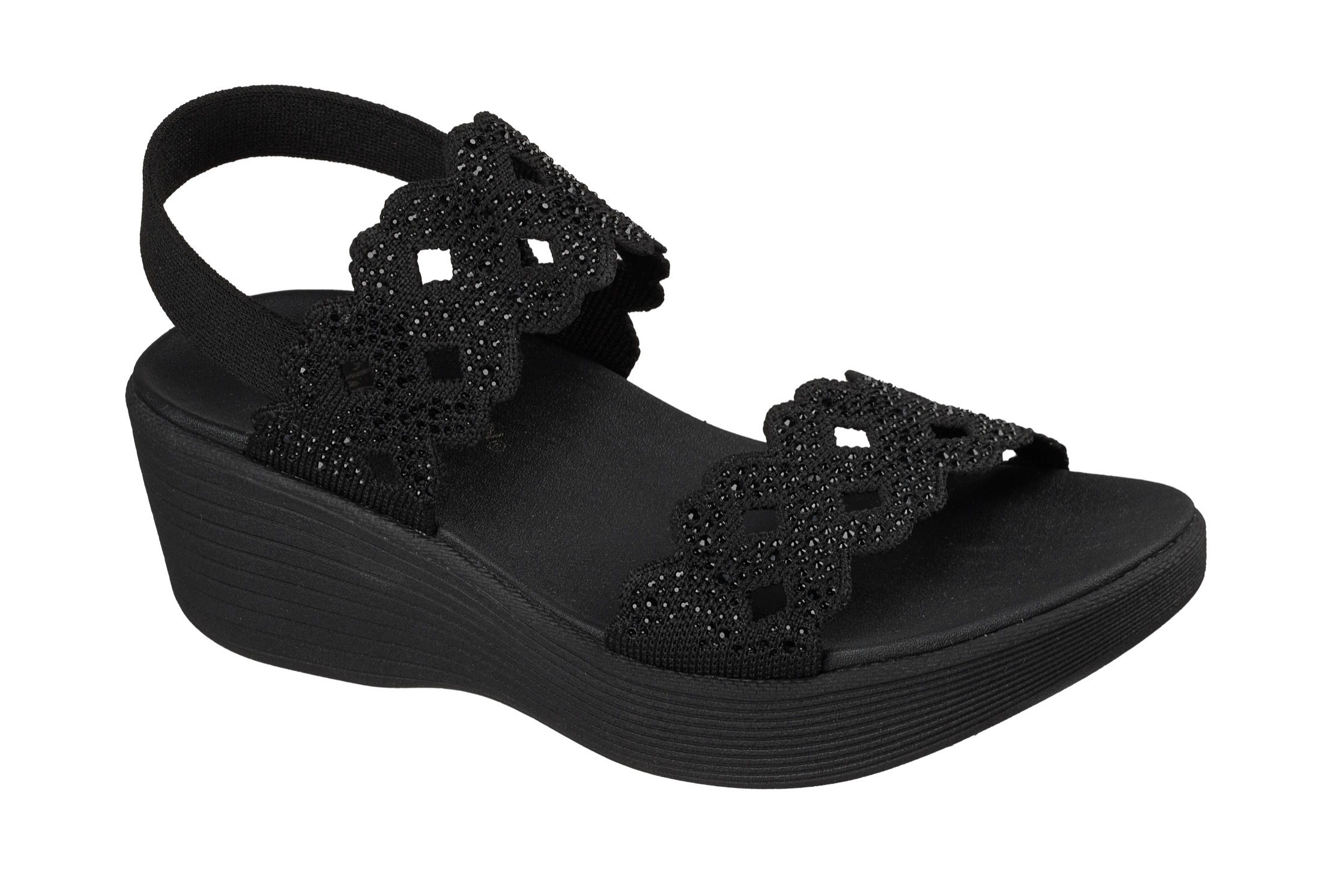 Fashionable flair and comfort combine in Skechers Parallel Lite – Sassy Dayz 2.0. This vegan comfort sandal features a knit upper with rhinestone and cut-out details, a gore backstrap, a platform wedge midsole, and a cushioned Luxe Foam® footbed.