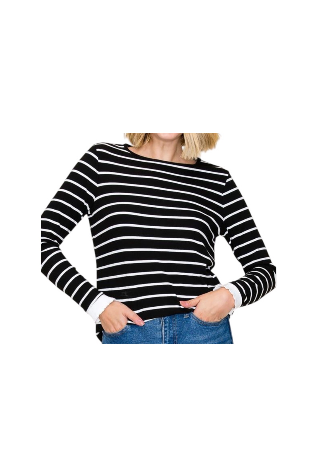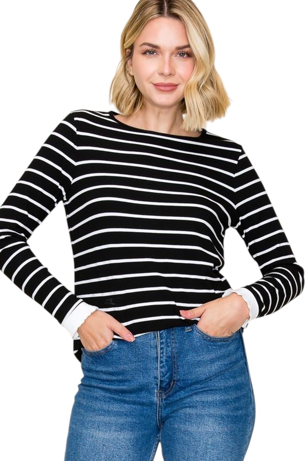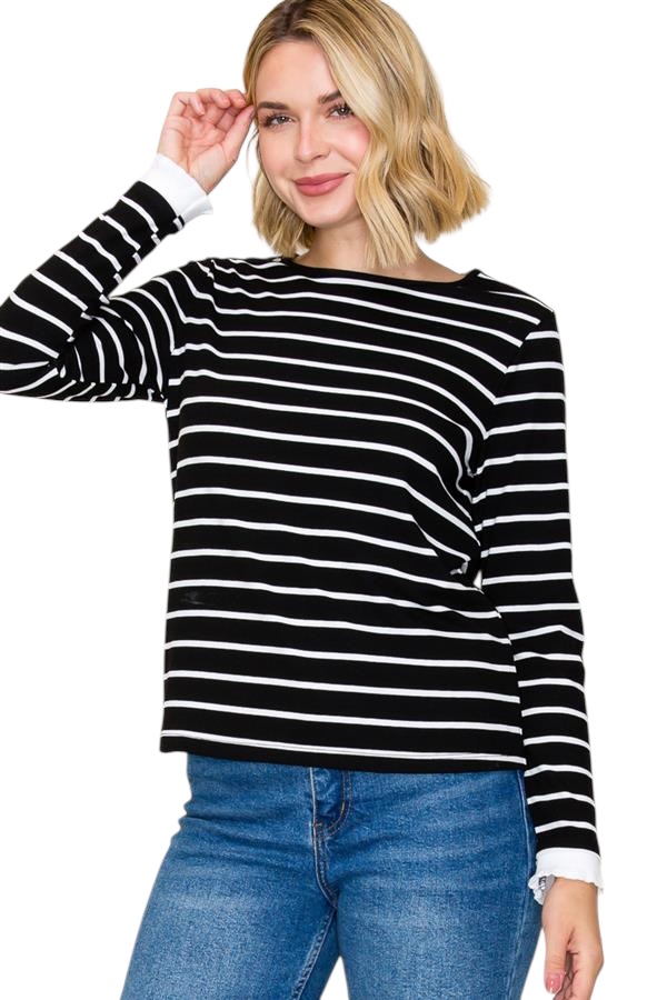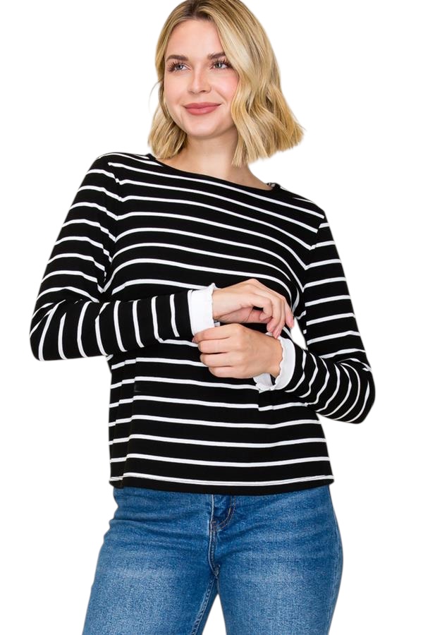 / STACCATO CREWNECK RUFFLE SLEEVE HEM STRIPE TOP