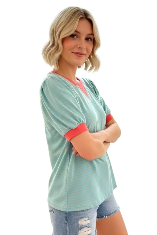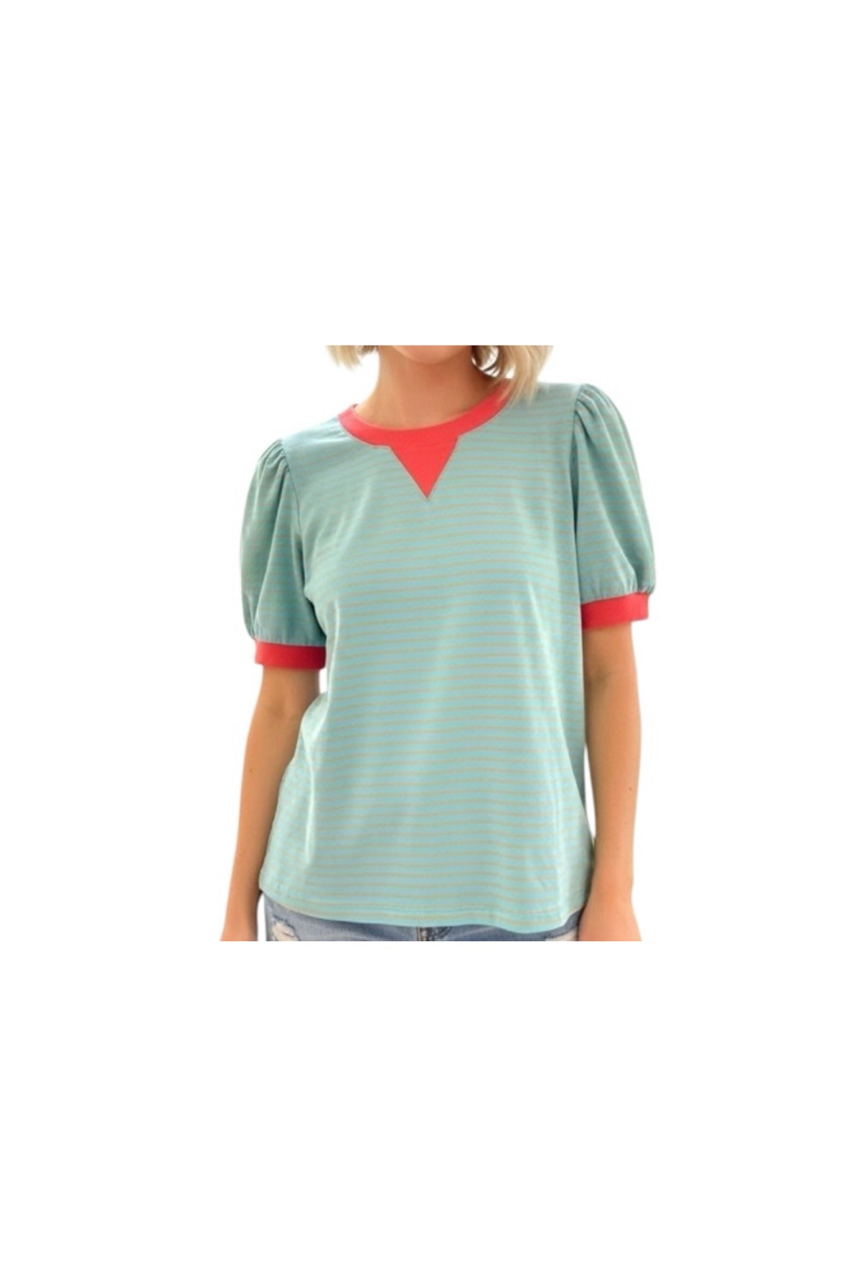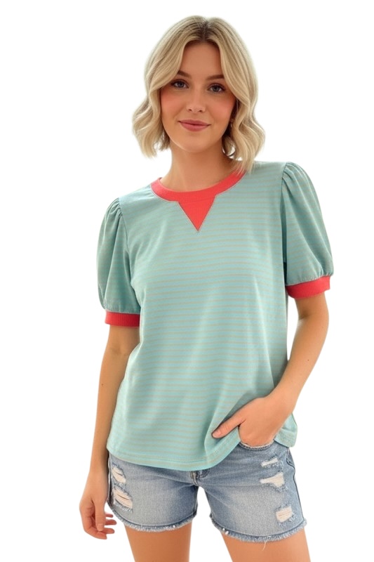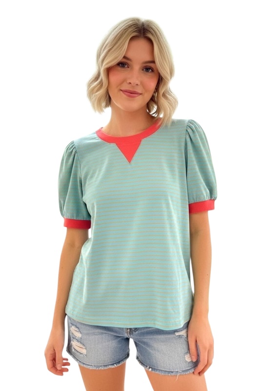 STACCATO COLOR TRIM SHORT SLEEVE STRIPE TOP