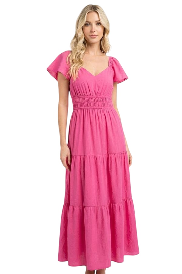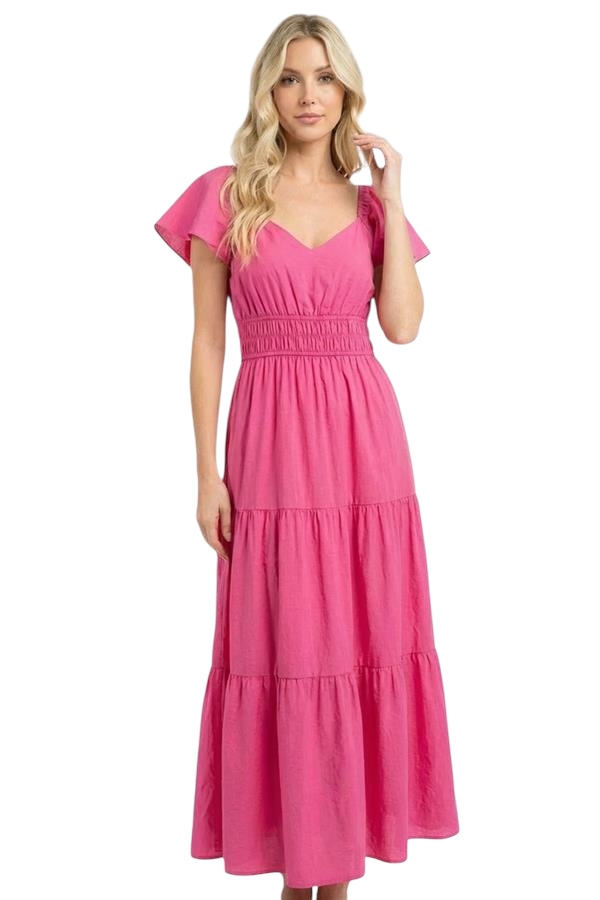 STACCATO V-NECK FLUTTER SLEEVE TIERED MAXI DRESS