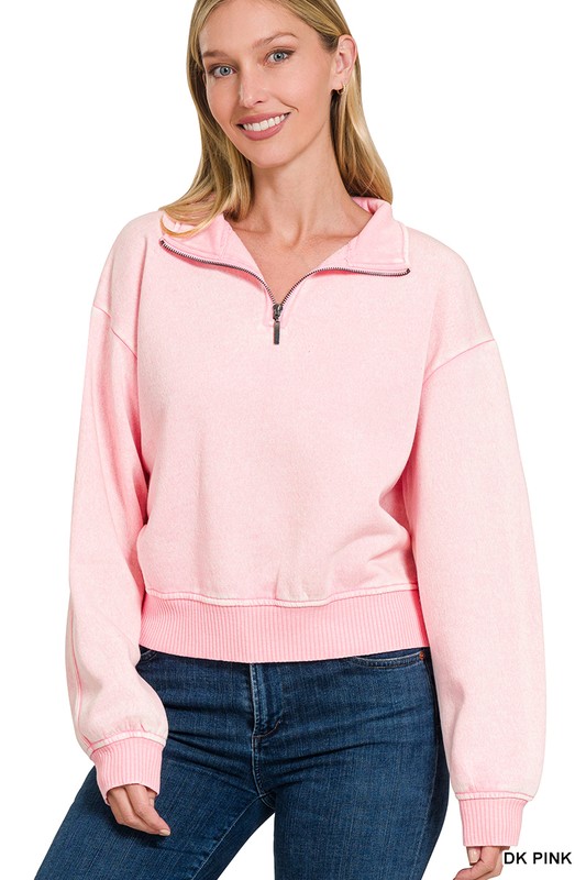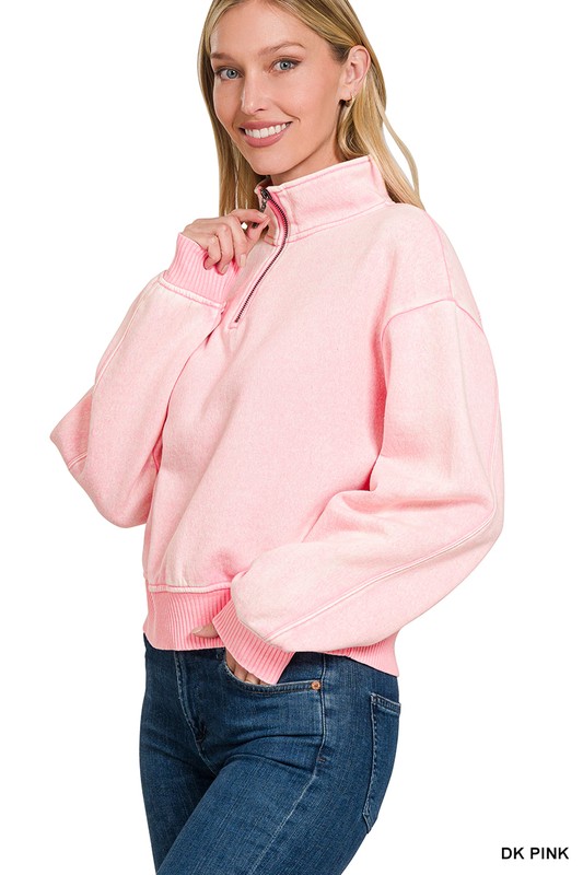 ZENANA ACID WASH FLEECE HALF ZIP